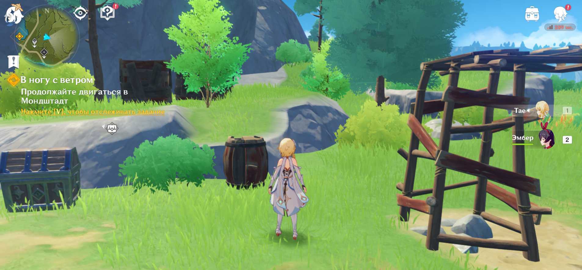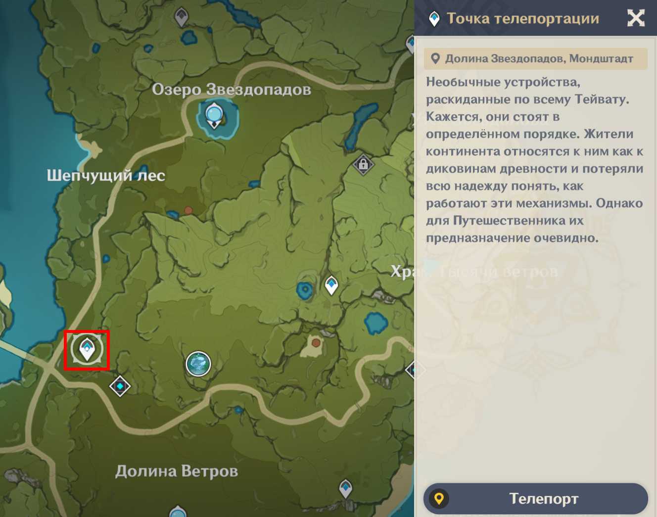Теперь, когда все нижние сундуки собраны, пройдемся по верхнему маршруту. Он начинается у телепорта рядом с Мондштадтом.