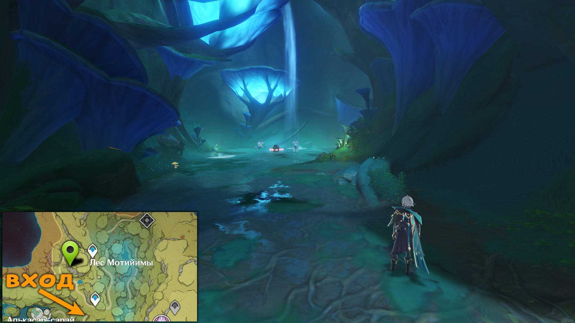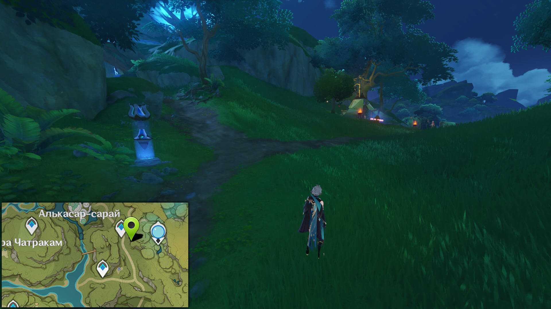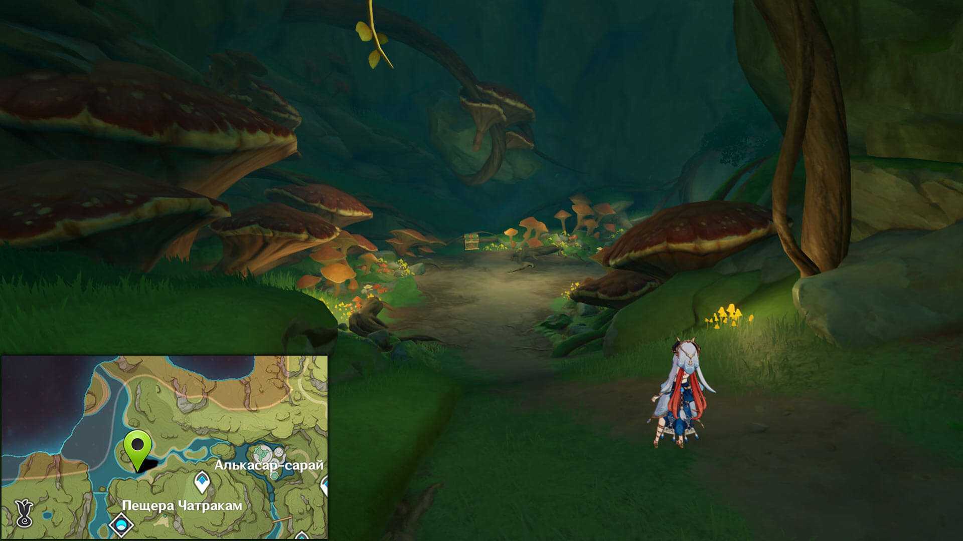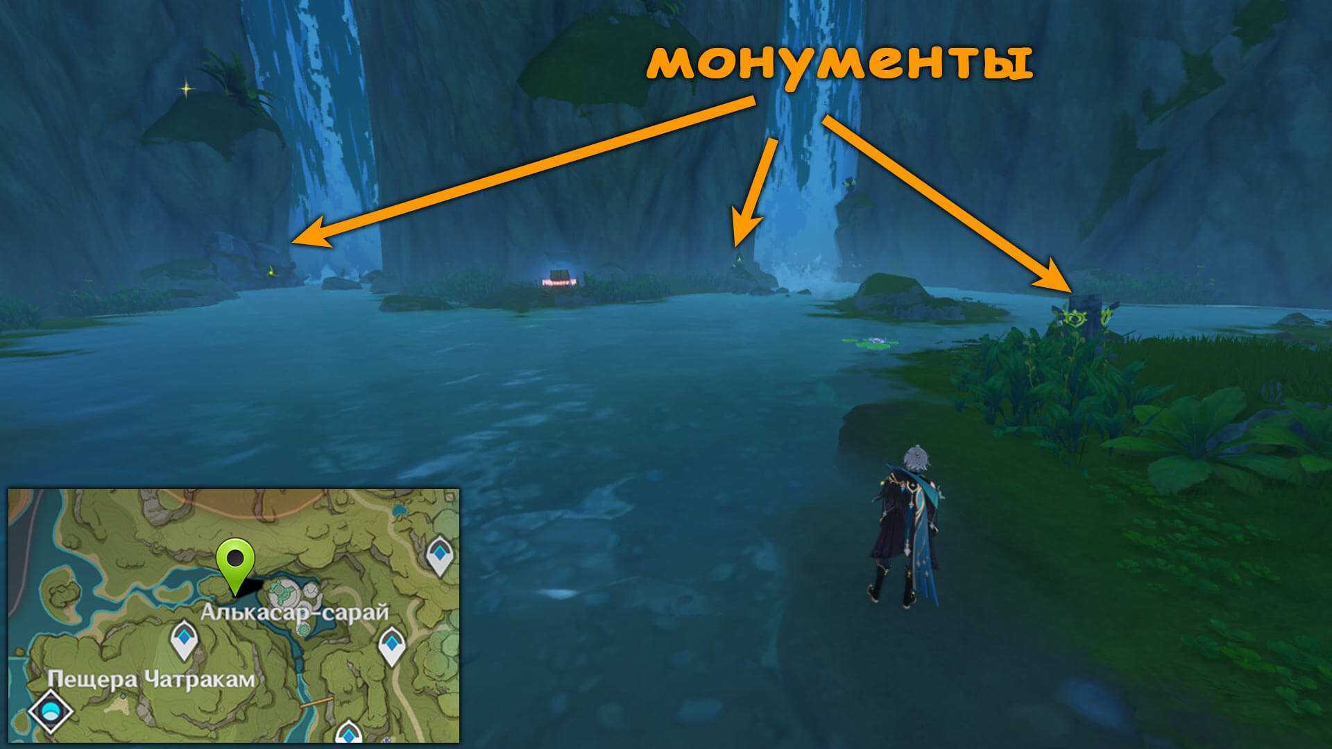 Находится внизу водопада в Алькасар–сарае. Активируем три Дендро монумента, третий находится за камнем, разрушить который можно с помощью Дендрогранума.