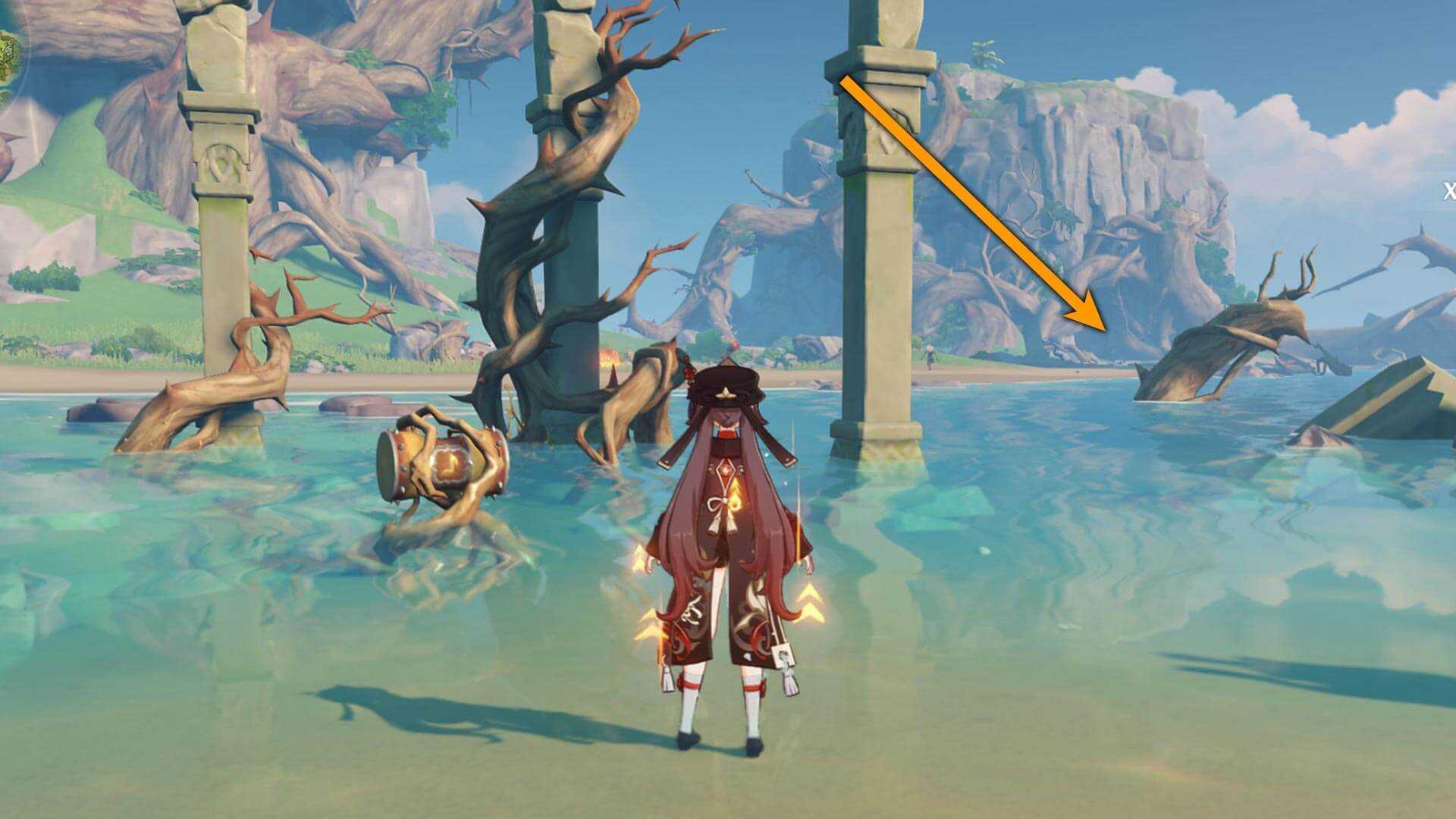 Телепортируйтесь к северной точке телепортации на Острове-близнеце в Архипелаге Золотое Яблоко. Игроки Genshin Impact должны заметить здесь две раковины на мини-карте, но сначала идите к западной, так как она находится на уровне земли и не требует карабкания.