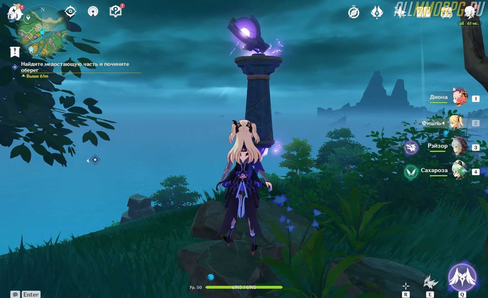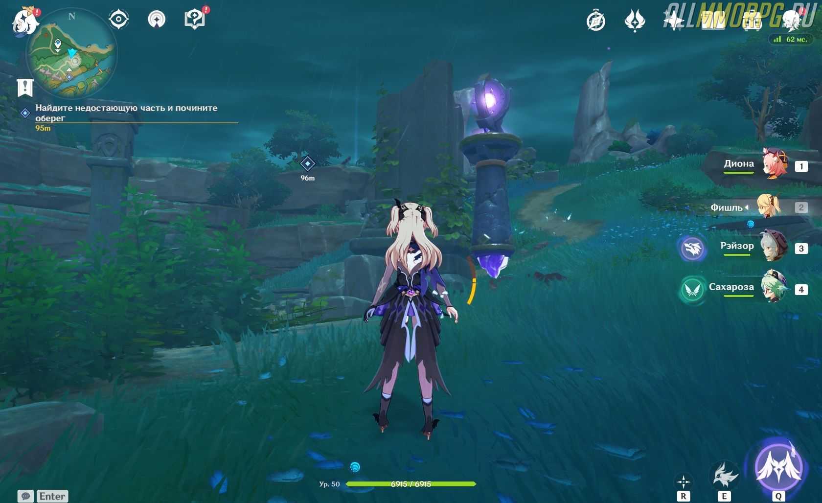- Теперь вам нужно найти недостающие части оберега. Воспользуйтесь чувством стихий и следуйте за фиолетовым потоком, чтобы найти первую часть оберега. По пути на вас нападут гидро-слаймы. Убейте их и идите дальше.