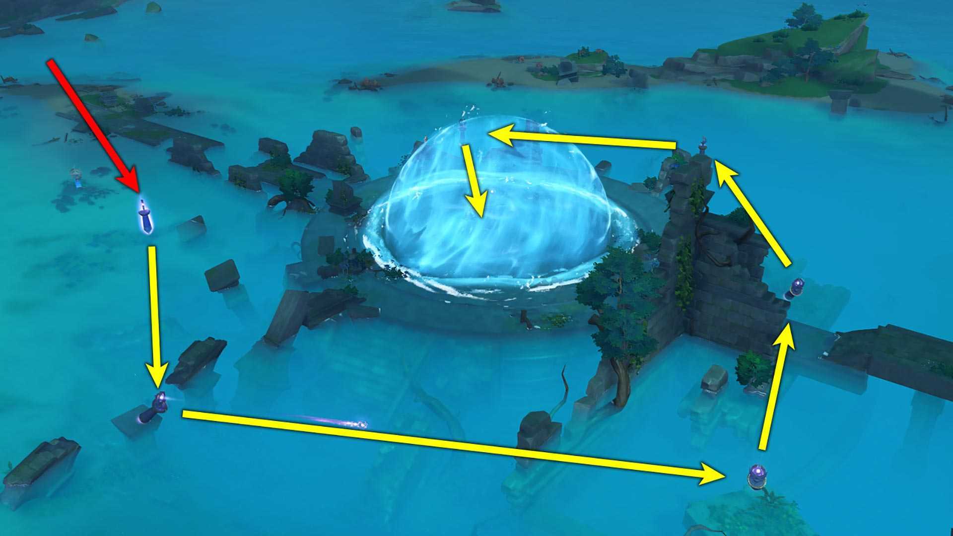 Обе части оберега спрятаны под водным куполом. Чтобы снять защиту, вам необходимо правильно активировать столбы. Подойдите к ним и взаимодействуйте для настройки высоты и поворота. На изображении ниже вы можете увидеть, как правильно расположить столбы для снятия водного купола. После вызовите любого лучника и ударьте его заряженной атакой по первому светящемуся столбу. Он выпустит электро-сгусток, который пролетит через все столбы и в итоге попадет в барьер. Если вы все сделали правильно, то запустится кат-сцена, в ходе которой вам покажут, как рассеивается водный купол. В том случае, если у вас не получается правильно расположить столбы, посмотрите изображения ниже. На скриншотах показано, как должен быть повернуть каждый из них.
