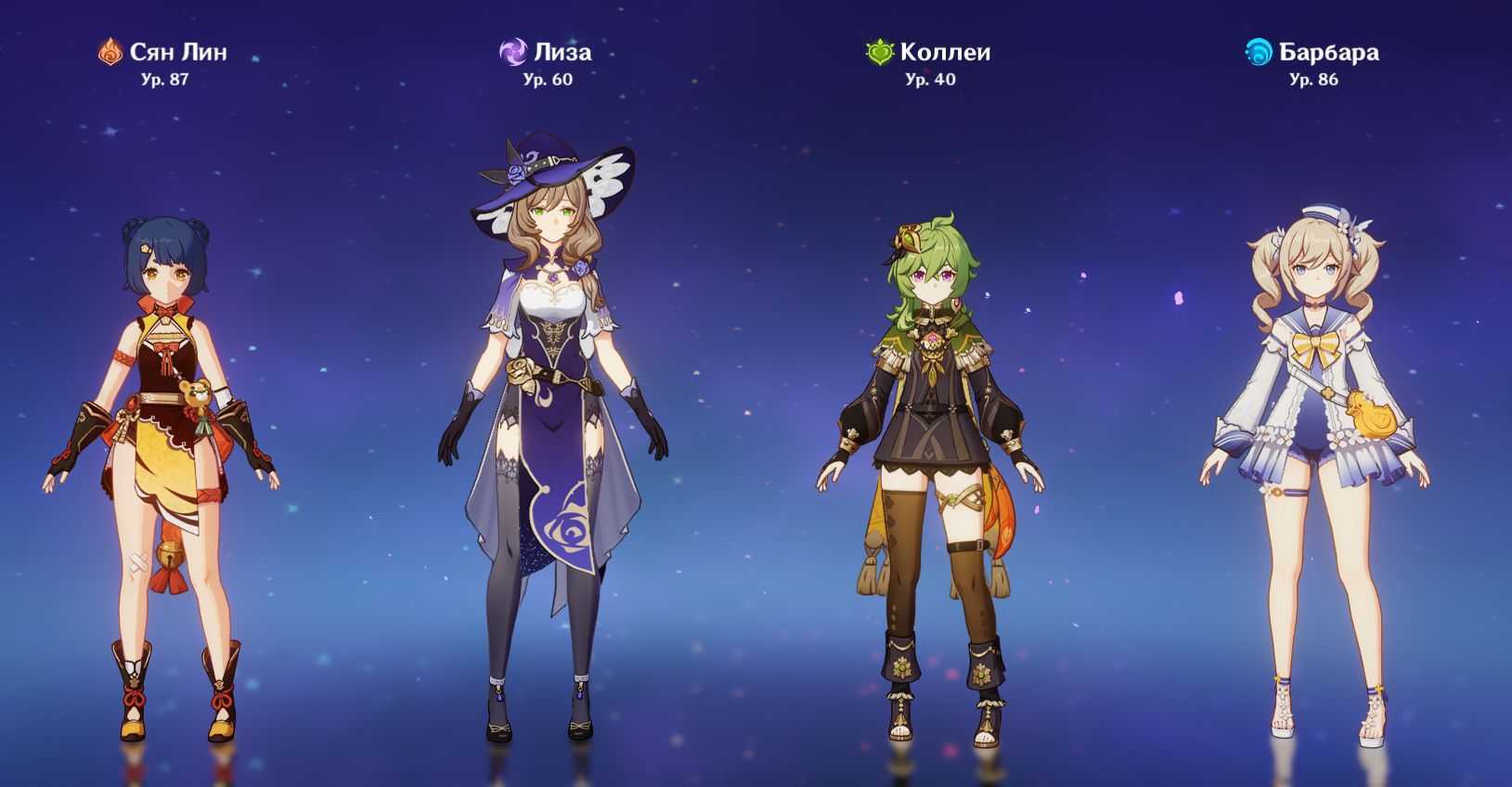Если у вас нет вообще платных персонажей, то берите Сян Лин как основу, добавляйте к ней Лизу для электро-статуса, Коллеи или дендро-Путешественника для пробуждения гипостазиса, а также Барбару в качестве хила. Сян Лин качайте в силу атаки и криты + Пиро урон, Лизу в мастерство стихий, Барбару — в ХП, Коллеи — в силу атаки и криты + Дендро урон.