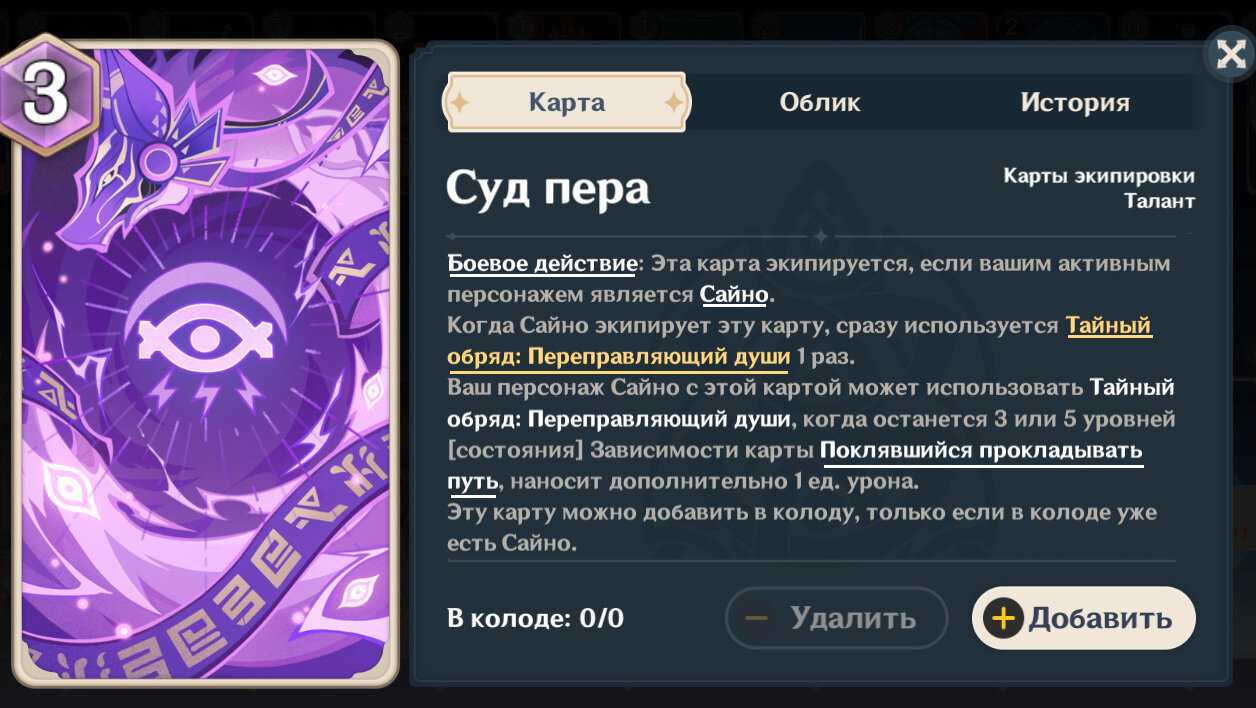 - Громовой стилет – карта события. Делает Кэ Цин активным персонажем и применяет ее элементальный навык. После этого Кэ Цин получает Электро инфузию, а следующий «Громовой стилет» не создается. Но когда Кэ Цин использует элементальный навык вместе с этой картой в руке, вместо создания дополнительного стилета этот сбрасывается и наделяет Кэ Цин Электро инфузией.