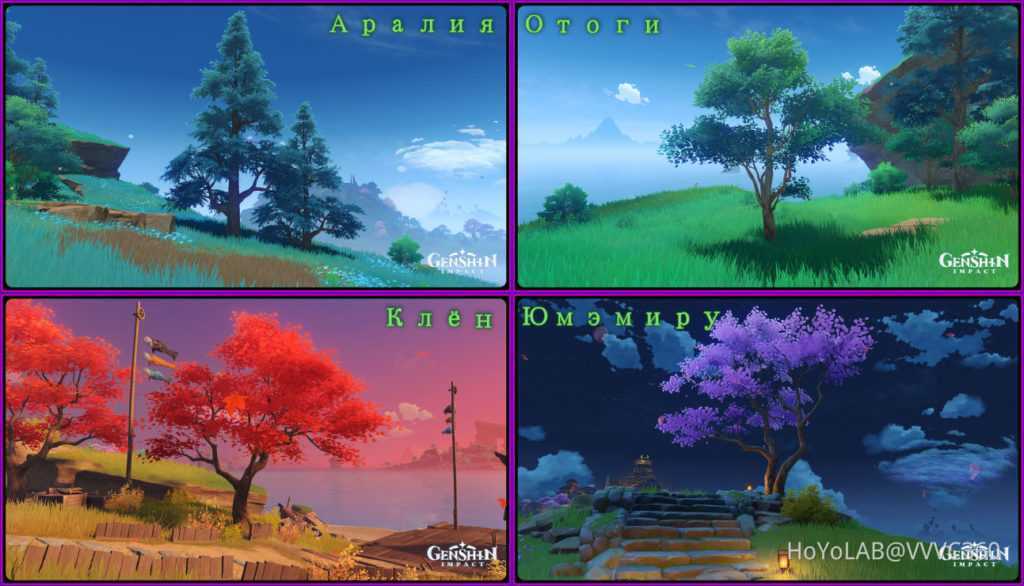 - Аралия – древесина инадзумского кедра. Произрастает на острове Наруками и Ясиори близ горных уступов.