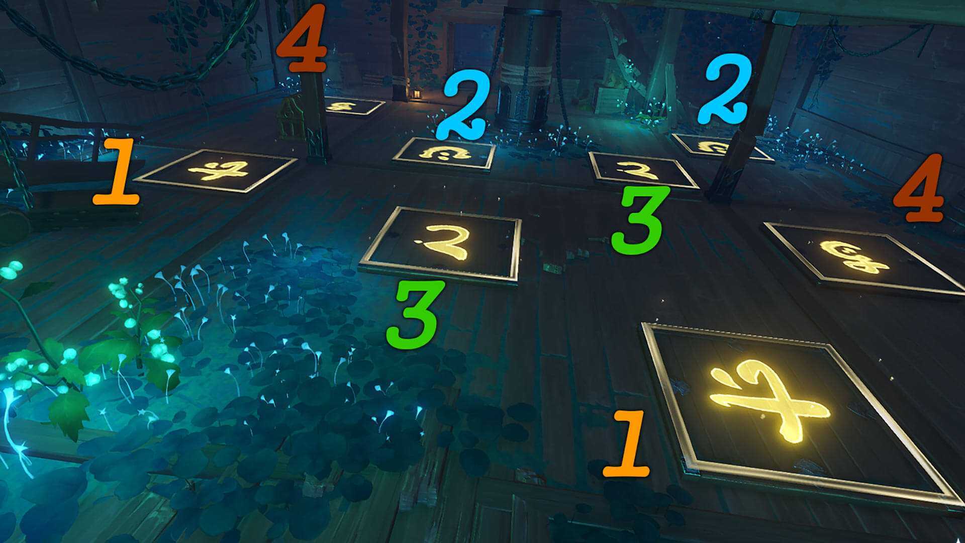 Решать загадки с плитами очень просто, это всего лишь игра на запоминание. Наступите на плиту, и на ней загорится символ. Если Вы наступите после этого на плиту с другим символом, они обе потухнут. Если на плиту с таким же символом — то обе загорятся и будут считаться «решенными». Решение показано выше.