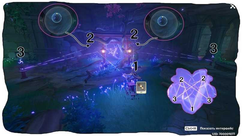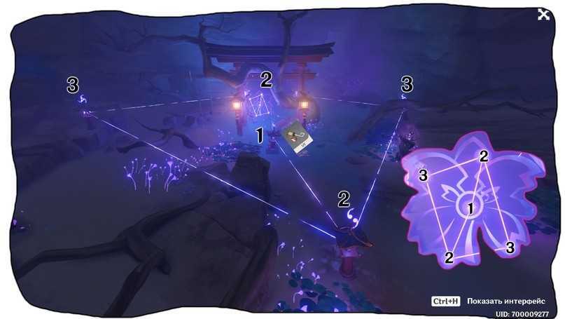Поднимите предмет, используйте Ветвь громовой сакуры и выходите через барьер. Напротив него привычная по прошлым квестам арка и зажигаемые фонари. За аркой по бокам на ветвях фигурки Земных кицунэ. Посмотрите на них через Линзу воспоминаний, чтобы появились еще два фонаря. Когда все это проделано, можно заняться очисткой. Кладите оберег и смотрите правильный порядок активации на засветившемся Электро символе.