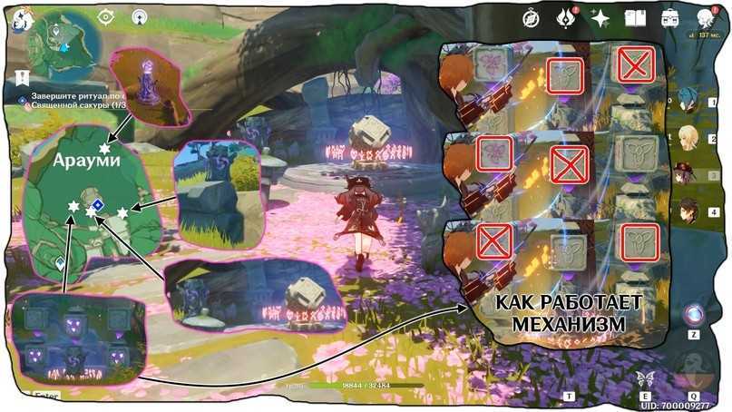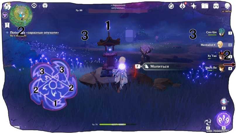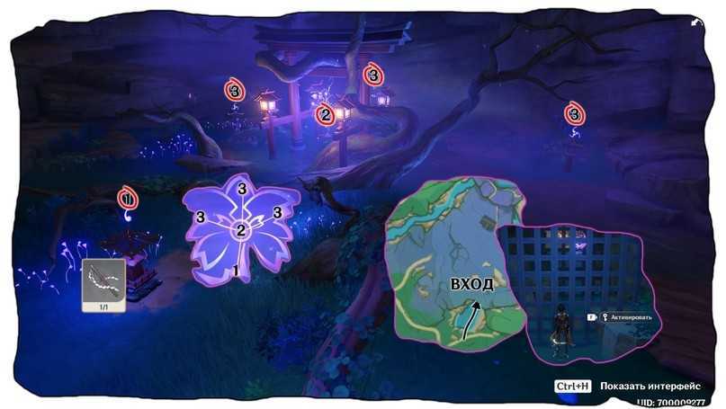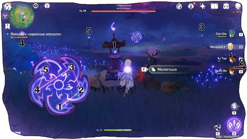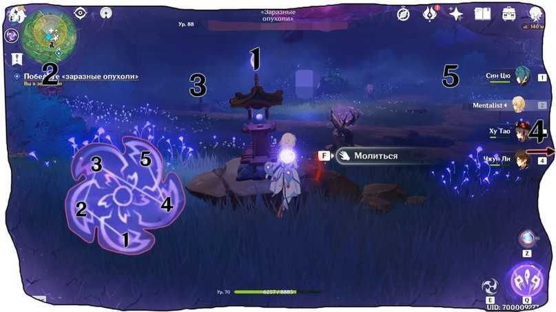 Установите для каждого из фонарей указанное на скриншоте количество лепестков, а затем нажмите возле стартового «Помолиться». Появится Грязь с корней Священной сакуры. Уничтожьте монстра и в статус прохождения квеста будет засчитан еще один снятый барьер.