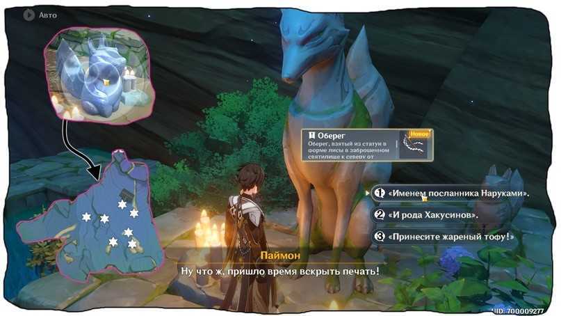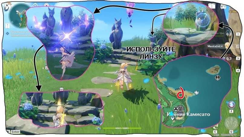 Отправляйтесь в указанную точку, посмотрите на Земную кицунэ через Линзу воспоминаний, а затем активируйте Небесную кицунэ Электро атакой. Заберите оберег в виде ключа, появившийся у ног статуи.