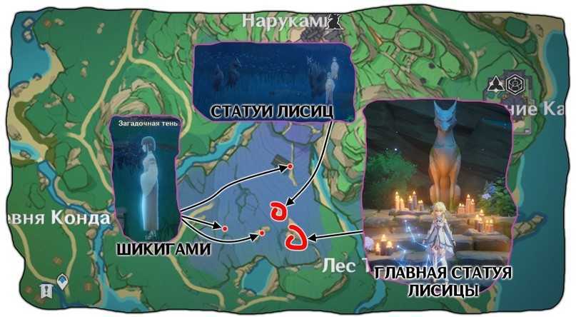 Направляйтесь в заброшенное святилище неподалеку от деревни Конда. По пути вам будут встречаться духи (загадочная тень). Если вы будете с ними взаимодействовать, то они будут перемещаться. Подойдите к главной статуе лисицы и прочитайте записи. Нам нужно собрать трех духов (шикигами) в одной точке со статуями лисиц. Взаимодействуйте с каждым духом, если дух остановился около лисиц, то идите следующему шикигами и далее собираем всех трех вместе.