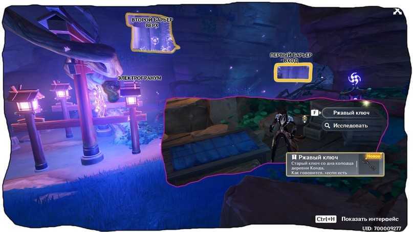 Когда бой закончится — первая часть задания завершится. Прежде, чем выйти пользователю нужно найти ключ, который располагается за фиолетовым барьером в восточной части от ворот Тори.