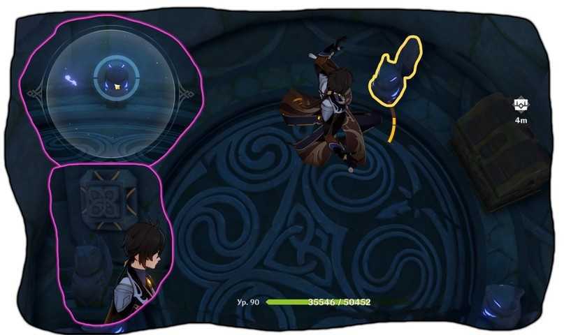 Достаточно использовать любую Электро атаку, чтобы тотем активировался. В точках 1-3 помешать могут лишь монстры (вокруг передвигаются отряды механизмов). Один из них будет заблокирован до победы над часовыми руин около него, а остальные можно сразу зажигать.