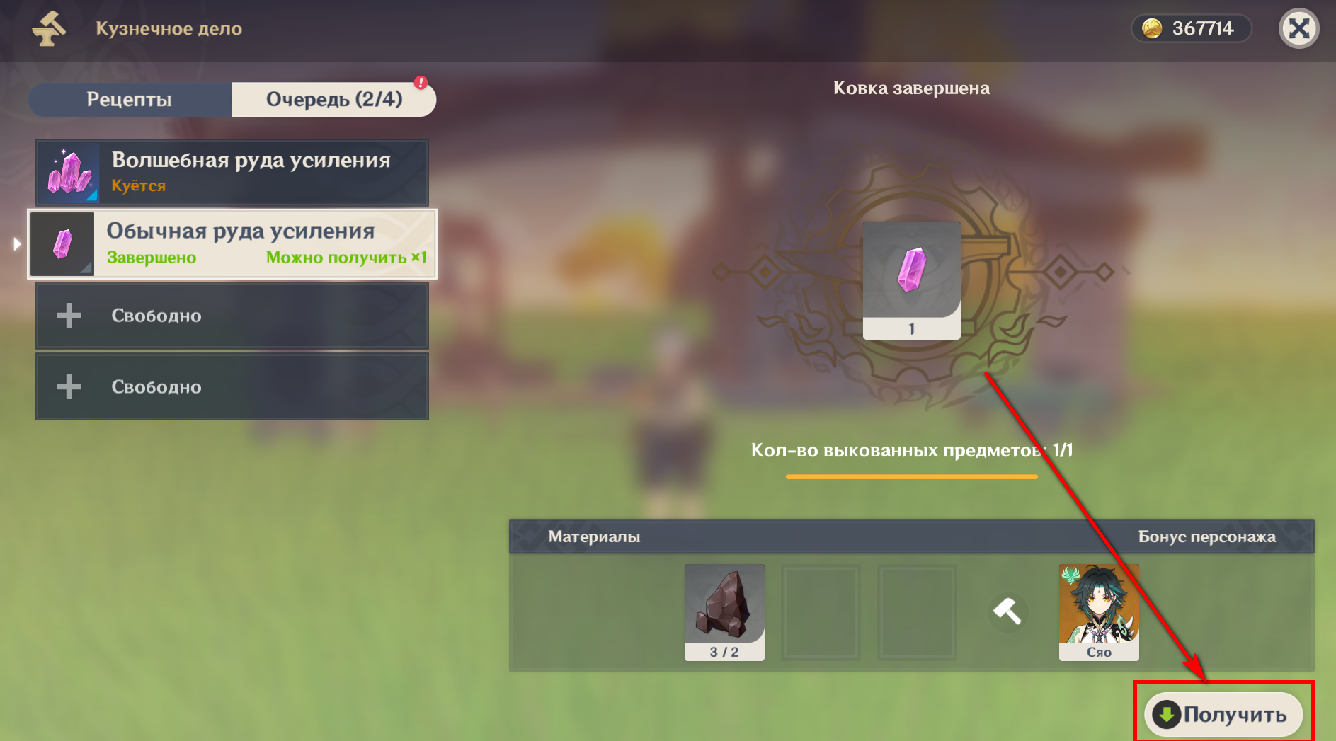 Время ковки всего 10 секунд. Когда предмет будет закончен, нажмите кнопку «Получить».