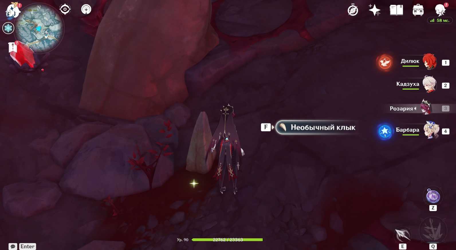 - Четвертый клык находится в пещере «Ущелья спящего дракона». От телепорта летите на планере и найдите вход в пещеру. По дороге на ребрах вам встретится багровый агат, поднимите его. В пещере обитают солдаты Фатуи, их стоит победить, а затем поднять Необычный клык.