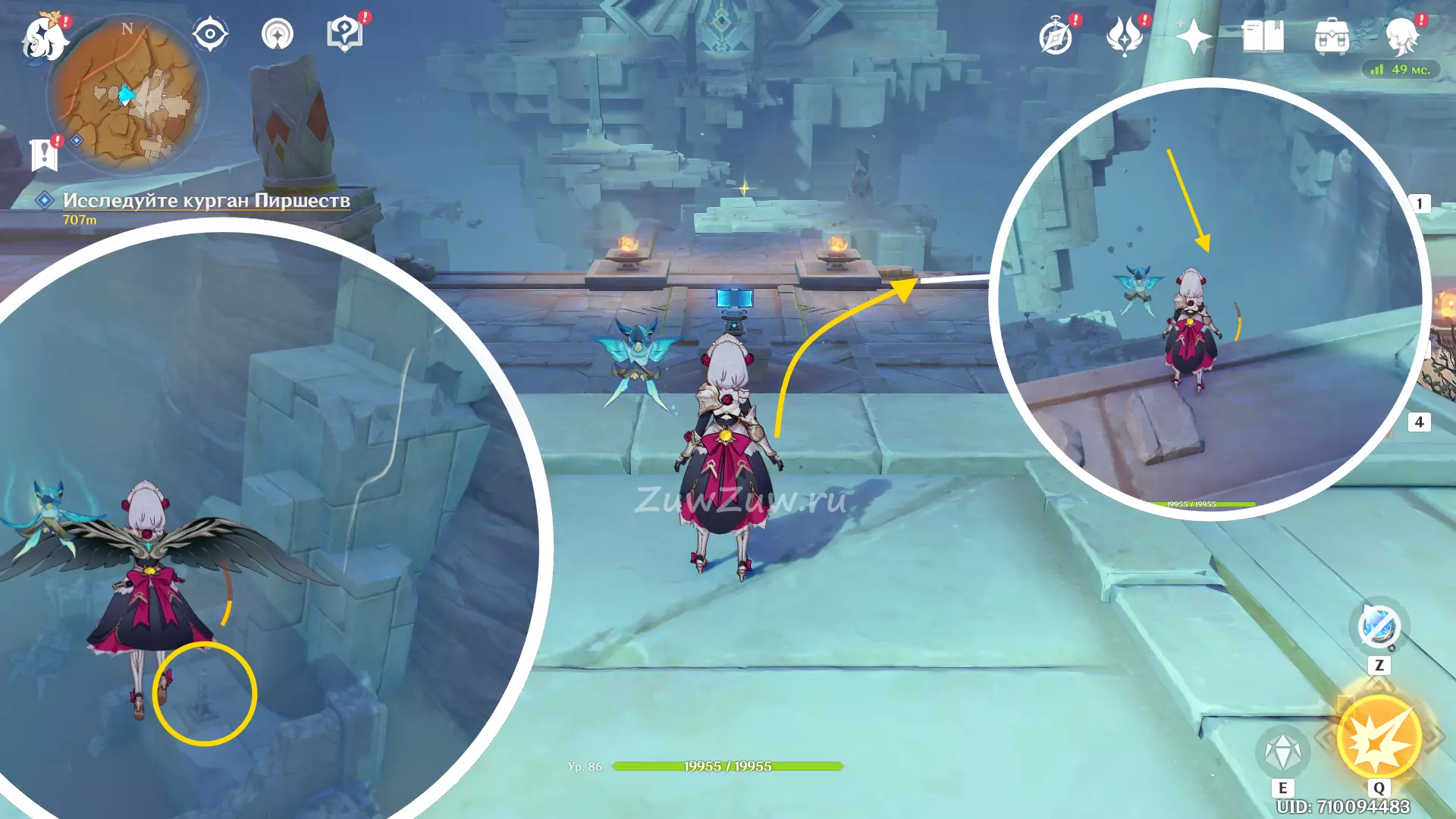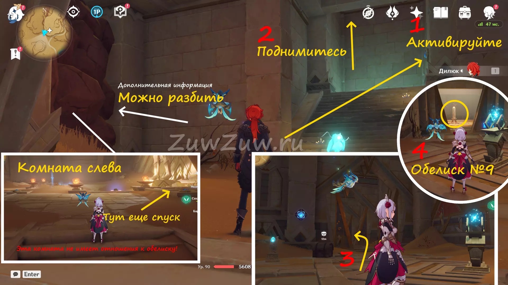 Бегите вперед и вскоре Паймон обратит внимание на то, что раньше не было дыры в полу, а теперь появилась. Прыгайте вниз и окажитесь прямо перед пятым обелиском