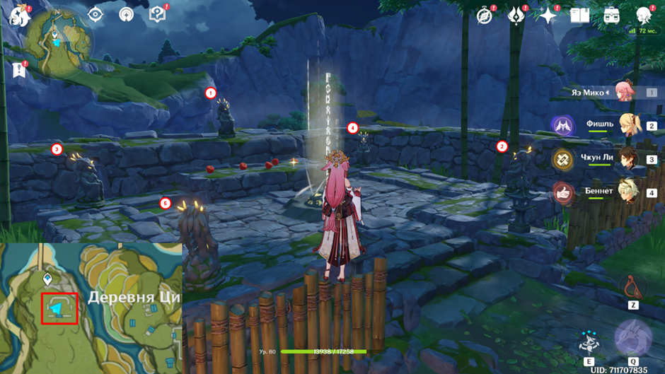 В руинах среди зарослей бамбука Путешественник обнаружит пять статуй драконов, которые необходимо активировать в определенном порядке, указанном в подсказке