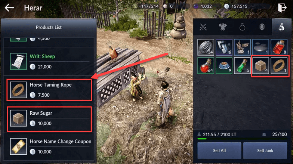 В меню обмена нужно купить Raw Sugar (неочищенный сахар) и Horse Taming Rope (лассо).