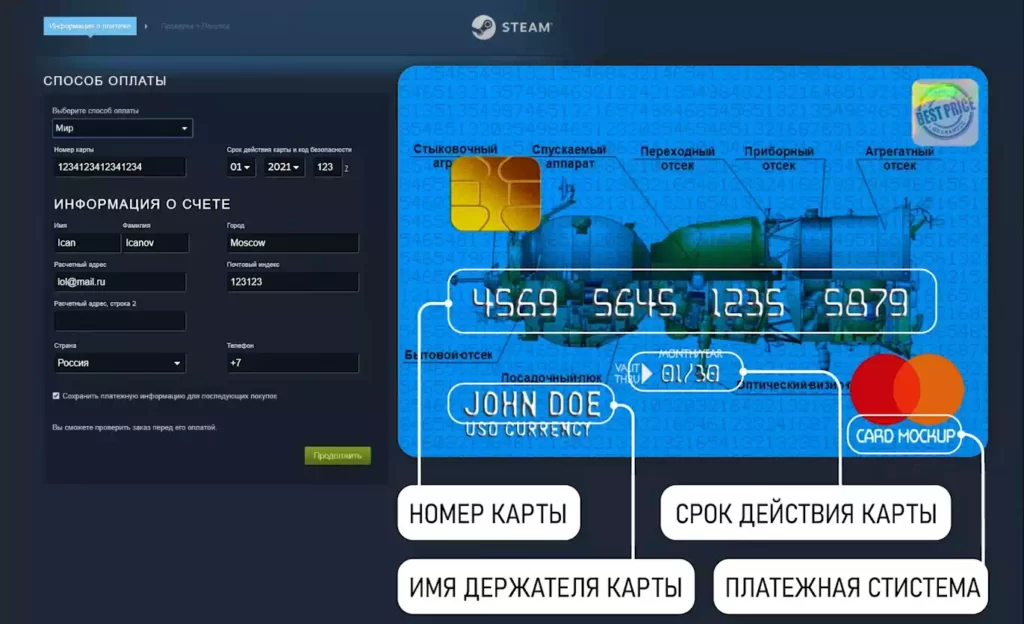 Поэтому если вы раньше испытывали проблемы при оплате с карты МИР, то сейчас их быть уже не должно. Достаточно просто правильно заполнить данные карты и обязательно указать свое имя и информацию в графах «Расчетный адрес», «Почтовый индекс» и т.д., иначе Steam просто не даст вам продолжить оплату.