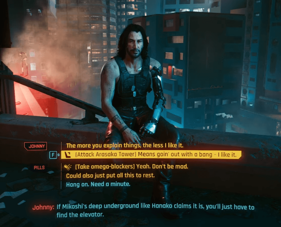 4. После того как Джонни с вами заговорит в реплике наконец-то появится еще один вариант, суть его заключается в «самоубийственной атаке на башню Аросаки». Выбираем именно его (вы ведь тоже ждали именно этой возможности всю игру? ;3 ).