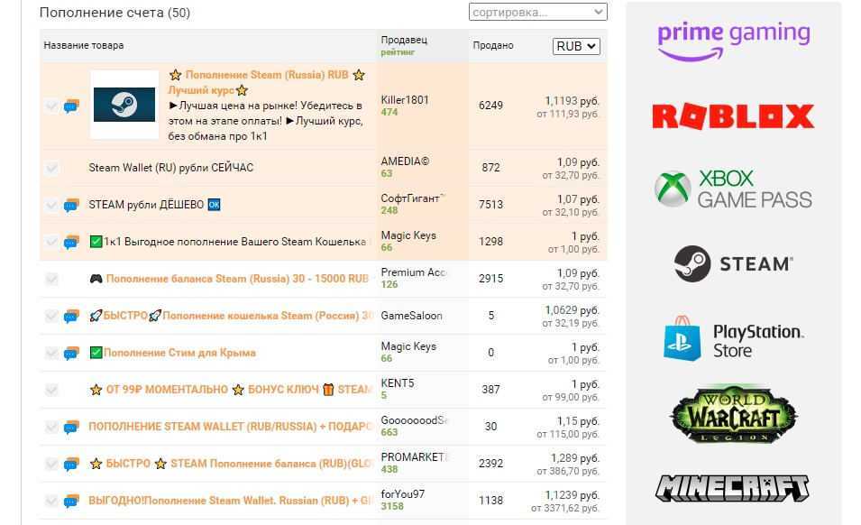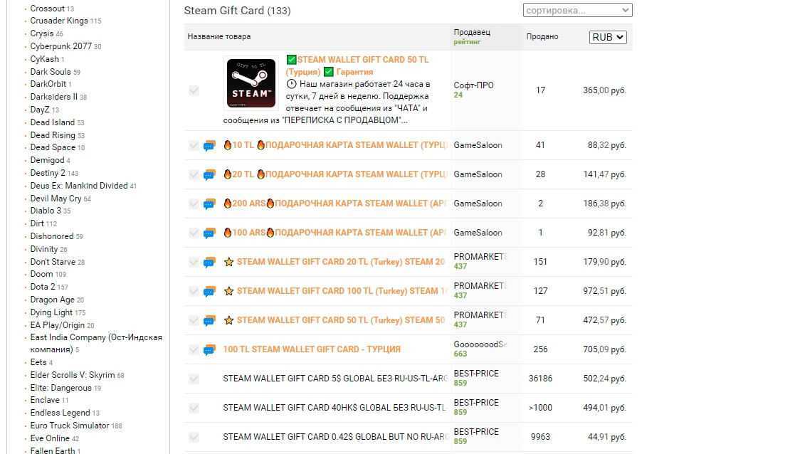 Конвертация валюты на счете Qiwi – не единственный способ обойти региональные ограничения. Та же торговая площадка Plati.ru (а в сети предостаточно альтернатив – WMCenter или FunPay) поддерживает продажу подарочных карт разного номинала – от 20 турецких лир до 50 долларов. Предложения по умолчанию сортируются в зависимости от количества просмотров и промежуточного спроса: сверху часто находятся наборы для Восточной Европы и США, Аргентины или всего мира сразу.