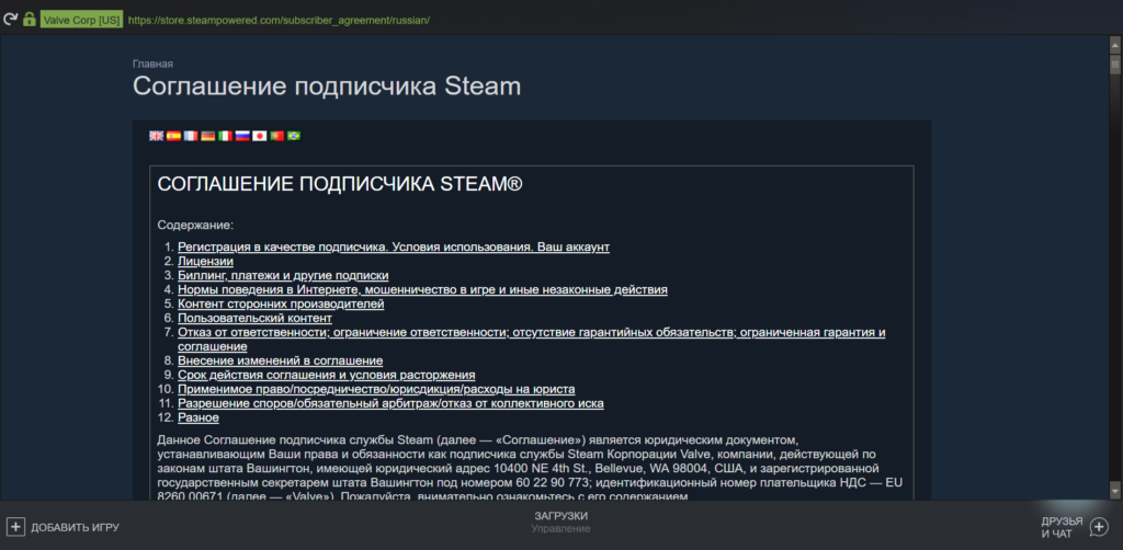Открыть лицензионное соглашение можно перейдя в «Справка» → «Соглашение подписчиков Steam»