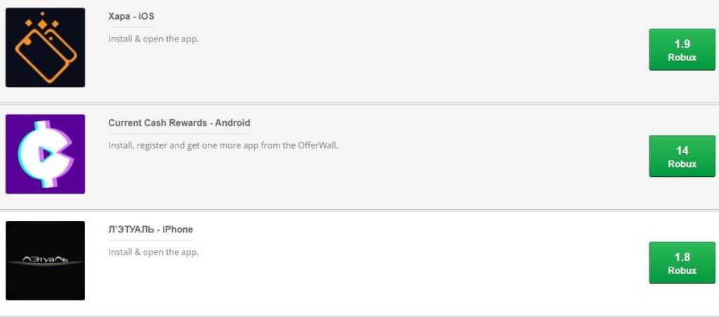 В разделе Earn R$ представлены логотипы партнеров. Выбирайте любого из них, вас направят на другой сайт, где можно будет взяться за работу. Это может быть установка приложений, регистрация в играх, прохождение опросов и многое другое. Очень удобно, что сразу представлено вознаграждение в Робуксах: