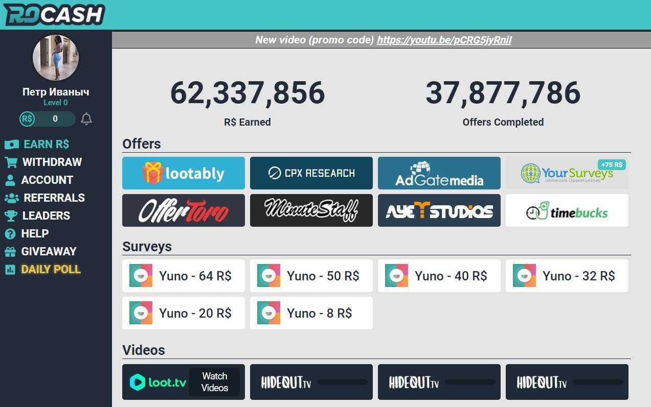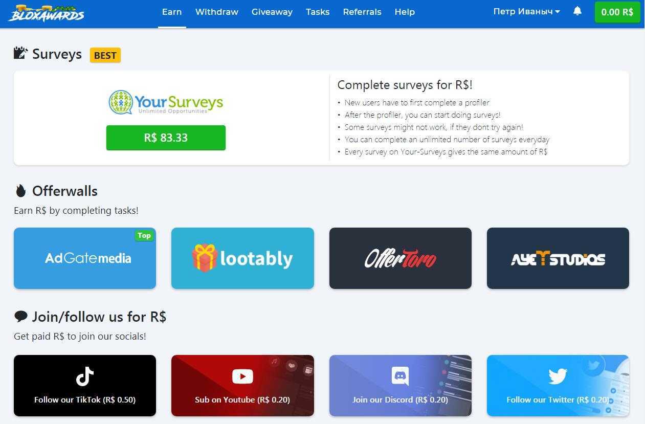 В отличие от двух первых ресурсов, заданий тут меньше. Зато есть разные бонусы и ежедневная раздача. Удобно, что баланс ведется в R$ и минимальный порог для вывода всего 10 Robux. Пользователи этого сайта уже вывели с него свыше 62 миллионов робуксов. Есть система уровней, за выполнение квестов начисляются бонусы.