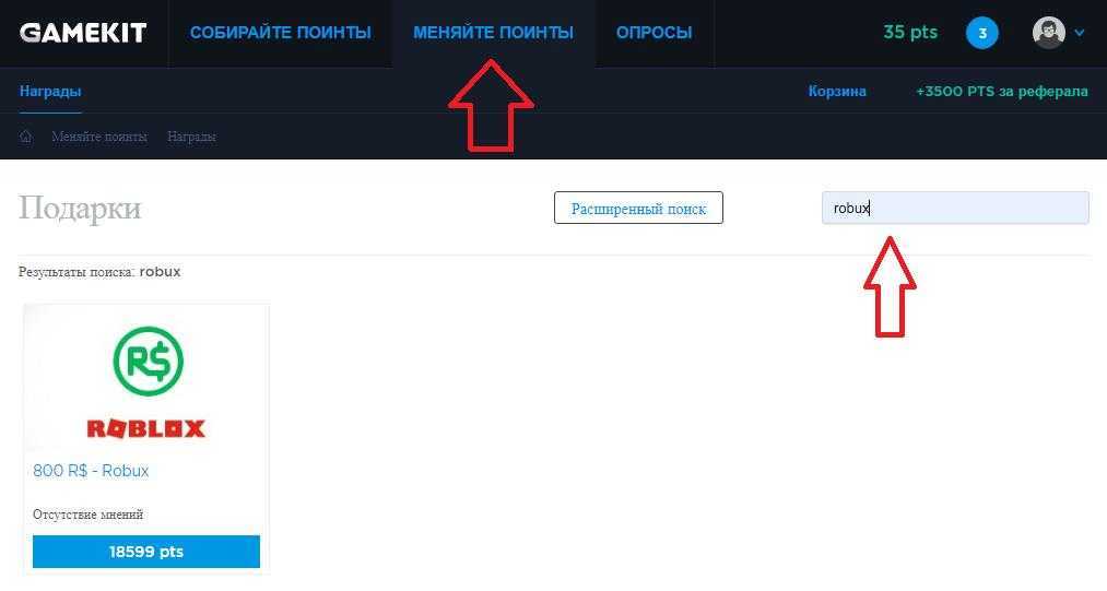 Работы много, можно собирать кучу pts, которые потом меняются на разные игровые деньги, в том числе Робуксы. Переходишь в раздел «Меняйте поинты», открывается список способов вывода pts, через форму поиска находим robux и видим такое предложение: