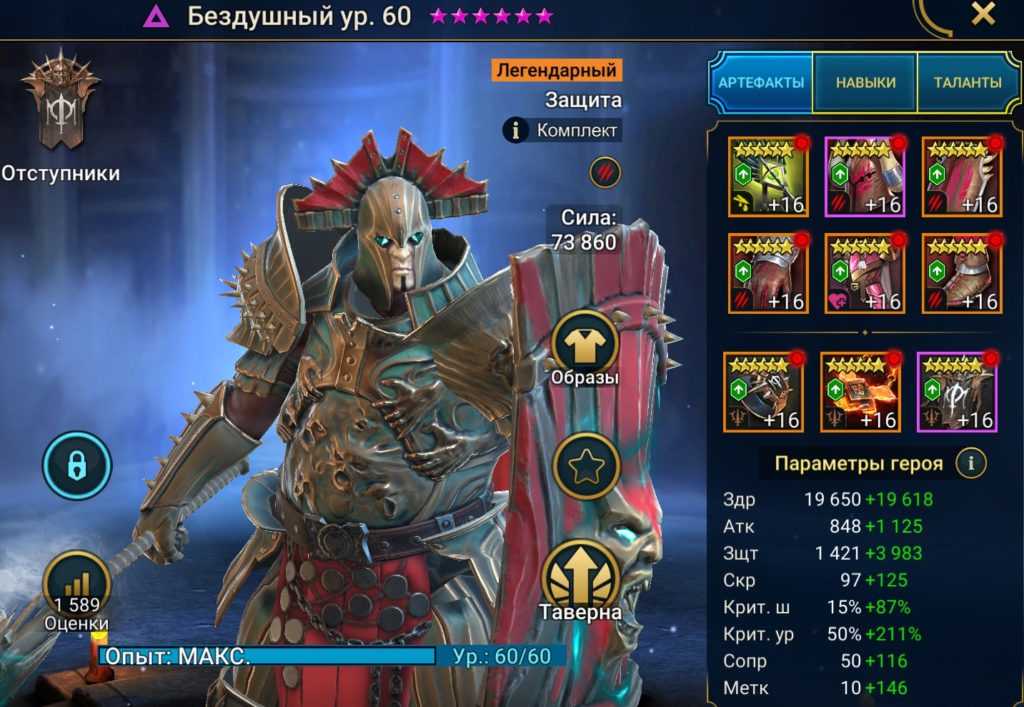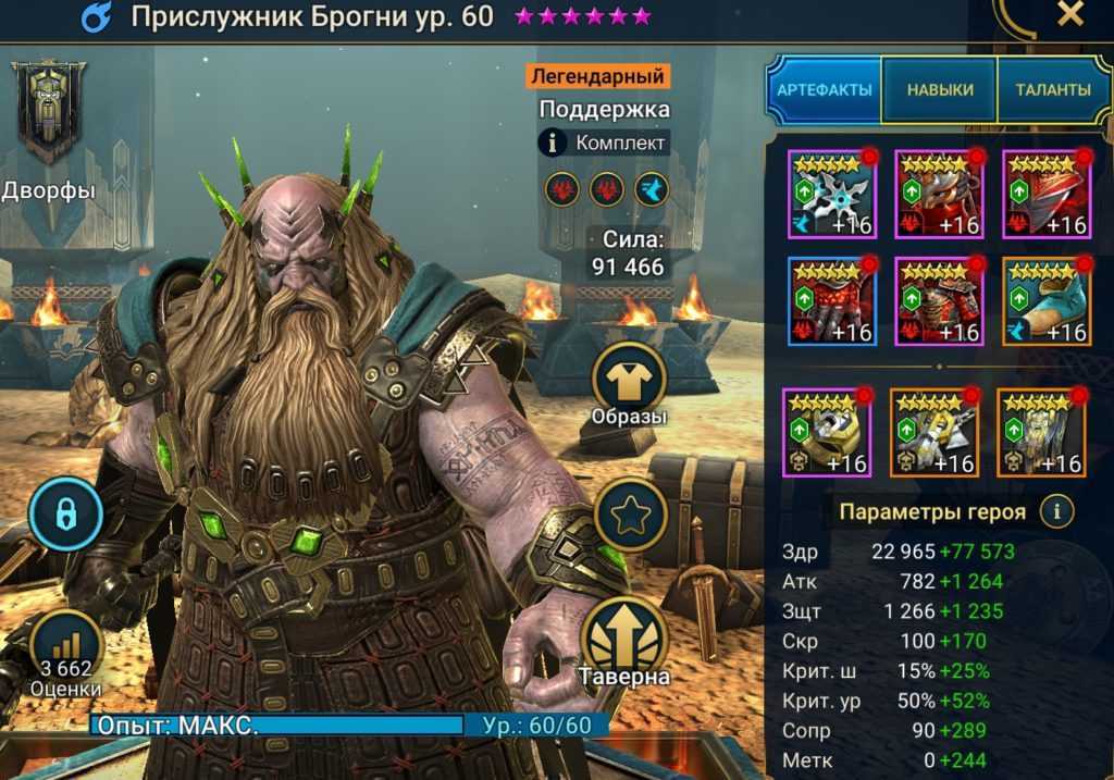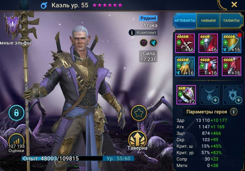 Единственный, кому требуются хорошие артефакты — стартовый герой. Сначала его нужно прокачать до 60-го уровня. Затем ему желательно дать хотя бы 70-80% КШ и максимально вложиться в атаку и КУ. Конечно, такая пачка не победит всех, но она поможет вам не застрять по миссиям арбитра и быстро проскочить первые две ветки заданий. Стартовому герою обязательно понадобятся и таланты, которые лучше купить за рубины.