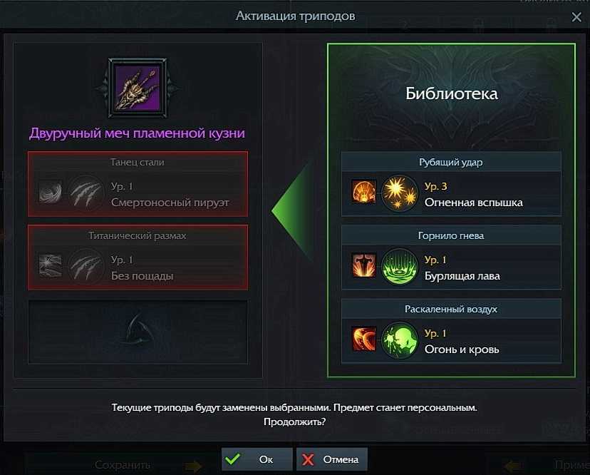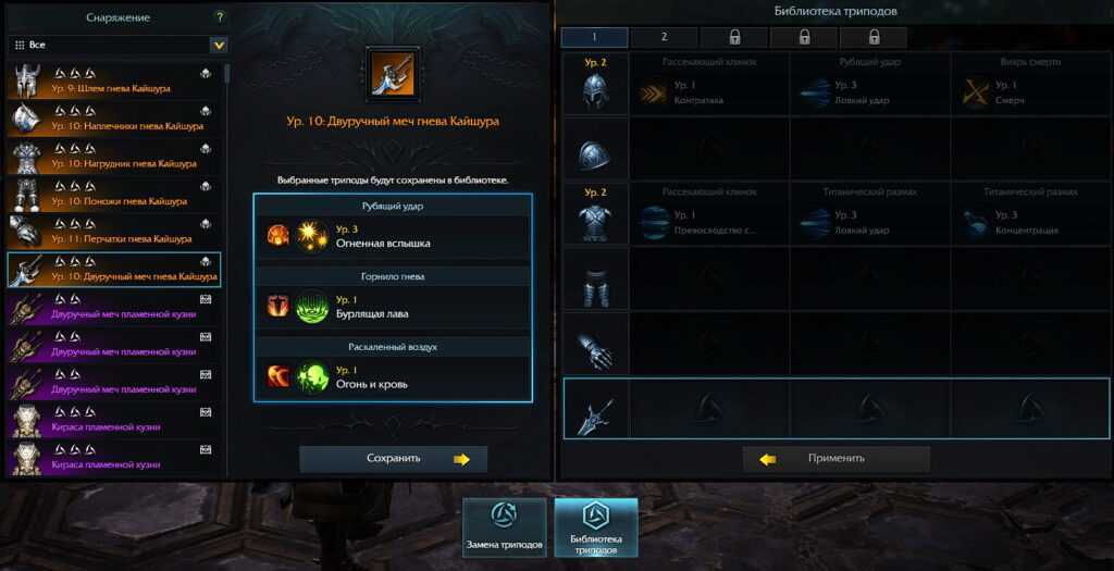 Перенесенные эффекты или идеально полученные изначально можно сохранить в библиотеку триподов. К примеру, на вашем шлеме 2-3 трипода, которые вы используете. Сохранив их в библиотеку, в дальнейшем вы сможете перенести их на новую экипировку уровнем выше.