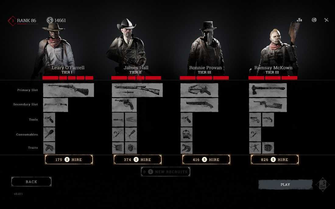Это основная вкладка главного меню, на которой вы будете проводить больше всего времени. Здесь вы можете управлять вашими охотниками. Охотники — слишком объемная тема, поэтому всю информацию связанную с ними вы можете найти в разделе «2. Охотники» ниже. Здесь же отмечу лишь то, что на этом экране вы нанимаете охотников, отправляете их в отставку, восстанавливаете им потерянные «палки» здоровья, а также приобретаете им снаряжение и перки.