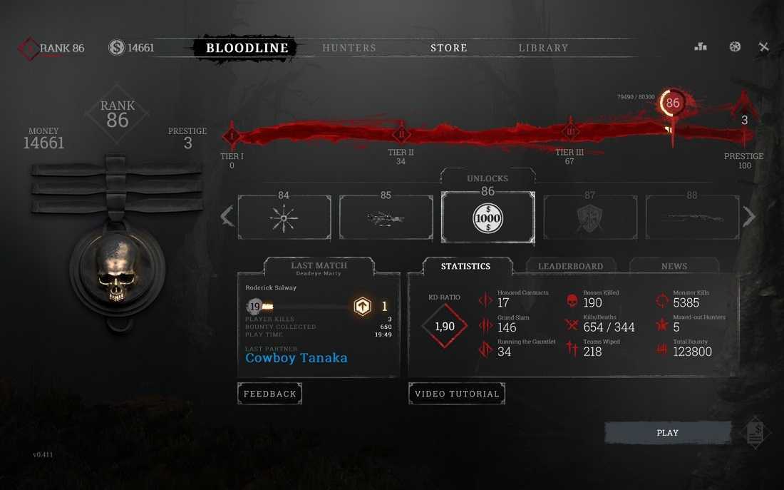 Этот вкладка отвечает за прогресс вашего аккаунта (Наследия). У вашего аккаунта есть уровень, для повышения которого необходим опыт (XP) зарабатываемый вашими охотниками во время матчей. Каждый уровень открывает вам доступ к новому оружию/инструменту/расходнику/перку или дает деньги. Также за каждые 4000 XP вы получаете по 666$.