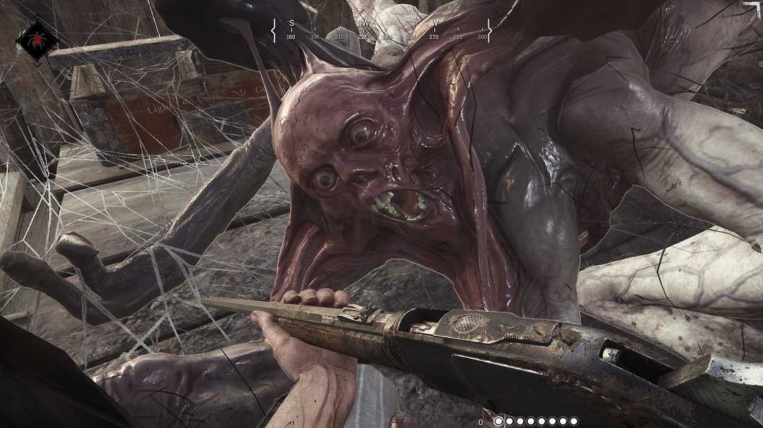 Паук же та еще зараза. Безусловным плюсом в борьбе с ним является то, что вы можете спокойно зайти к нему в логово, закрыть входы, заставить их капканами и начать разбираться с этим существом. Основная же проблема в борьбе с пауком заключается в том, что по этой заразе сложно попасть. Он постоянно совершает перебежки с этажа на этаж, из одного темного угла в другой, и вам с напарником приходится, как двум дурачкам бегать по всему зданию и стрелять по нему. Ладно бы только это, но этот товарищ еще и огрызается. Периодически он достаточно метко плюется облаками яда. Если вы попали в такое, у вас начинает уменьшаться здоровье до тех пор, пока вы из этого облака не выйдете (или оно не исчезнет, но исчезнет оно очень нескоро, вы в нем 5 раз помереть успеет). Здоровье уменьшается медленно, а вот эффект от отравления никто не отменял. В темном здании, да еще и под отравлением разглядеть паука или подкрадывающегося вражеского охотника будет еще сложнее. Также паук может прыгать на вас, сбивая с ног и нанося приличный урон. Не пытайтесь убежать, если видите, что он готовится к прыжку (визжит и поднимает передние лапы), наоборот атакуйте его. Это скорее всего прервет процесс и обиженное паукообразное убежит в очередной угол.