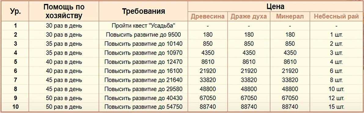 Здесь всё вполне логично: чтобы усадьба развивалась игроку следует её улучшать. Реализовать задуманное можно, если нажмёте на кнопку «Постройки». У каждого улучшения есть своё требование и собственная цена. Поэтому предлагаем быстро рассмотреть каждую постройку: