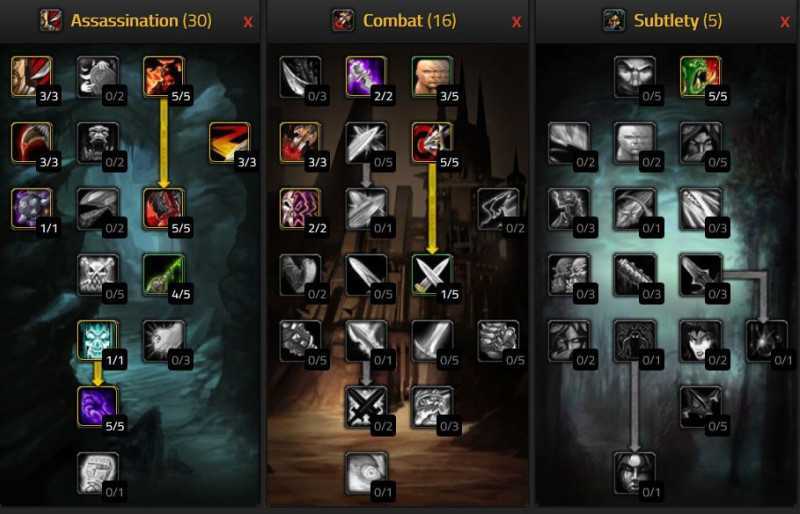 If you want to use daggers, then you’ll want to use a 30/16/5 build. You’ll notice that you don’t pick up Vigor, as 10 extra energy just isn’t useful. You instead pick up a point in Dual Wield Specialization and 5 points in Opportunity in the subtlety tree. Combined with 3 points in Improved Backstab, this is the optimal Backstab assassination dagger rogue build.
