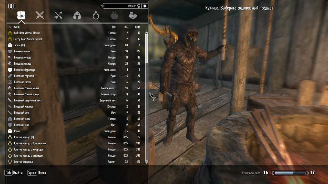 - Изготавливайте в кузнице железные кинжалы, пока не откроете перк «Двемерские доспехи» в «Кузнечном деле». Крафтите Двемерские луки до тех пор, пока у вас не закончатся ресурсы. Если вы решили не качать кузнечное дело, то скупите у торговцев в городах Скайрима незачарованное снаряжение;