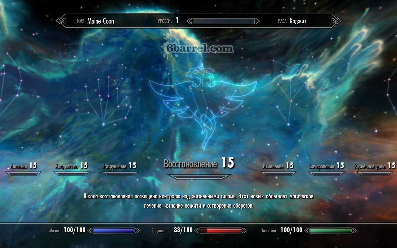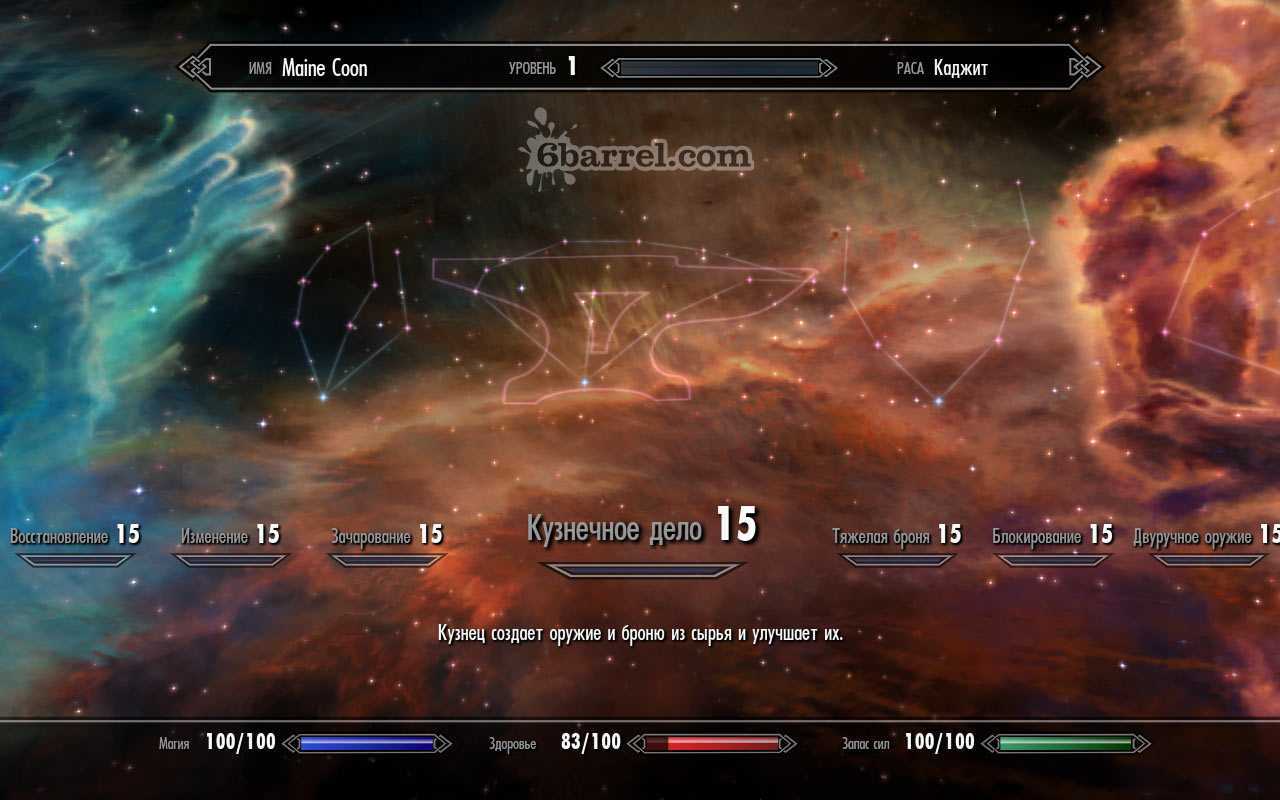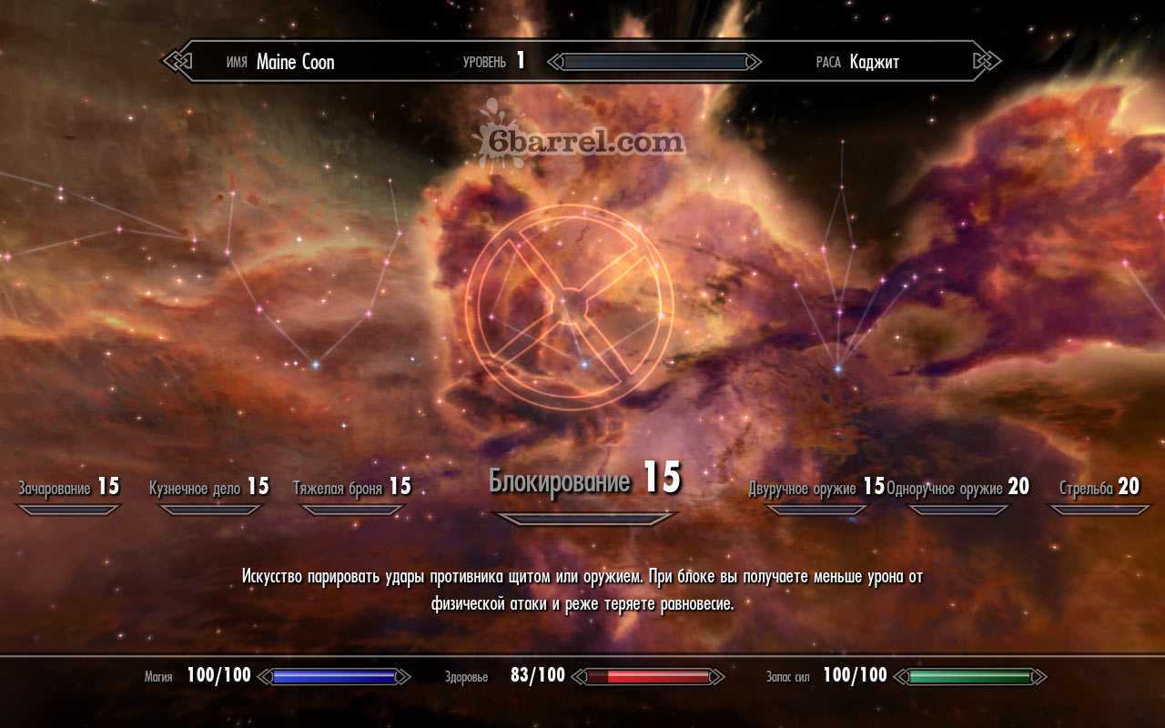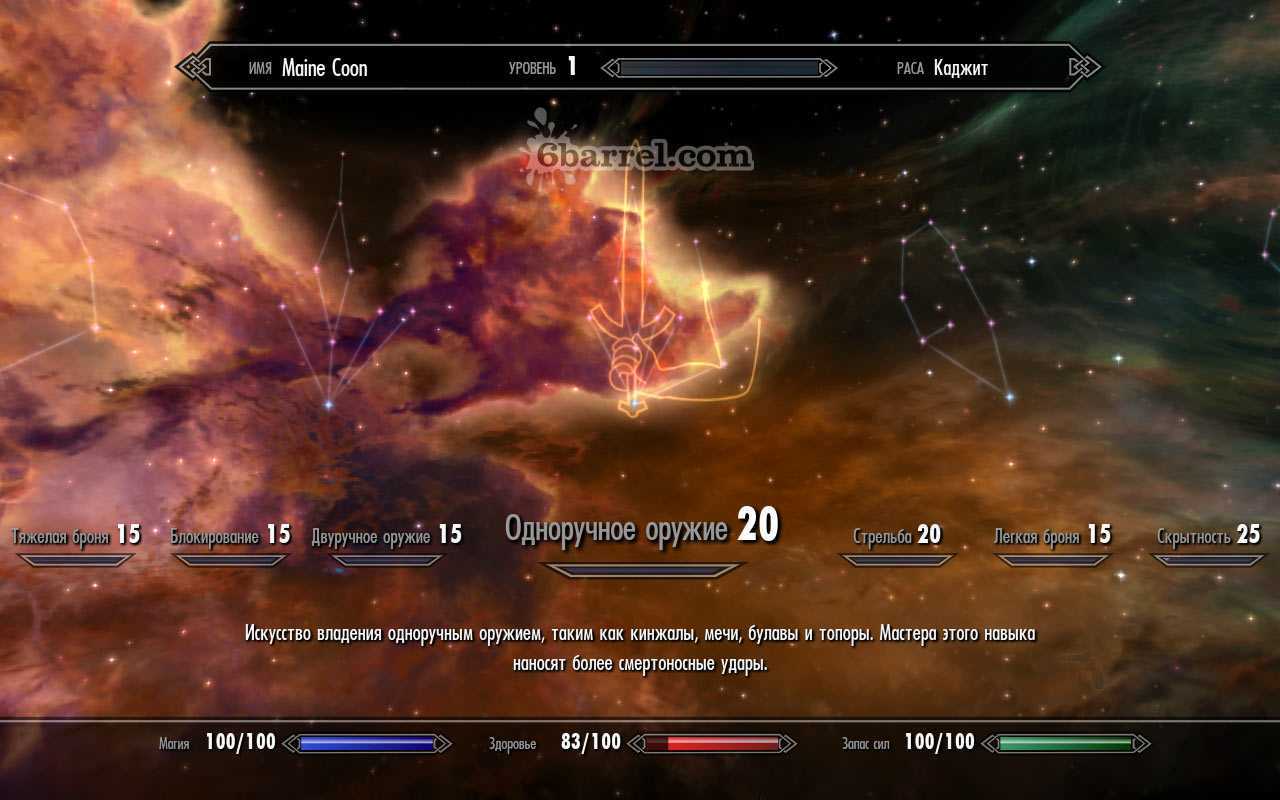 Для ассасина нам потребуется раса, которая имеет изначальные бонусы к Стрельбе, Алхимии, Скрытности и заодно к Легкой броне, которая так же окажется полезной. Такие расы, как Темный эльф, Каджит и Лесной эльф отлично подходят для создания убийц, благодаря их врожденным навыкам. Проще всего начать с Каджита т.к эта раса имеет изначальный навык скрытности, равный 25.