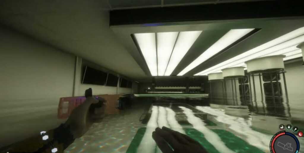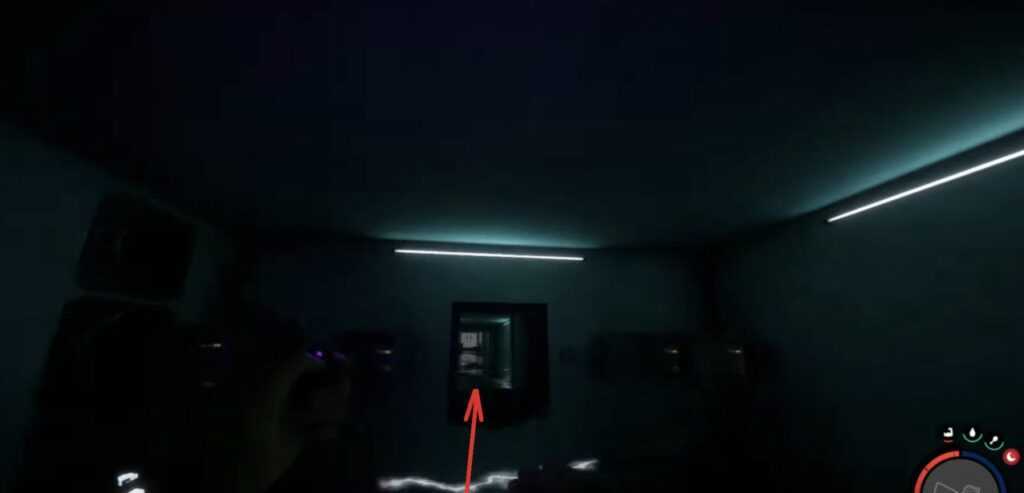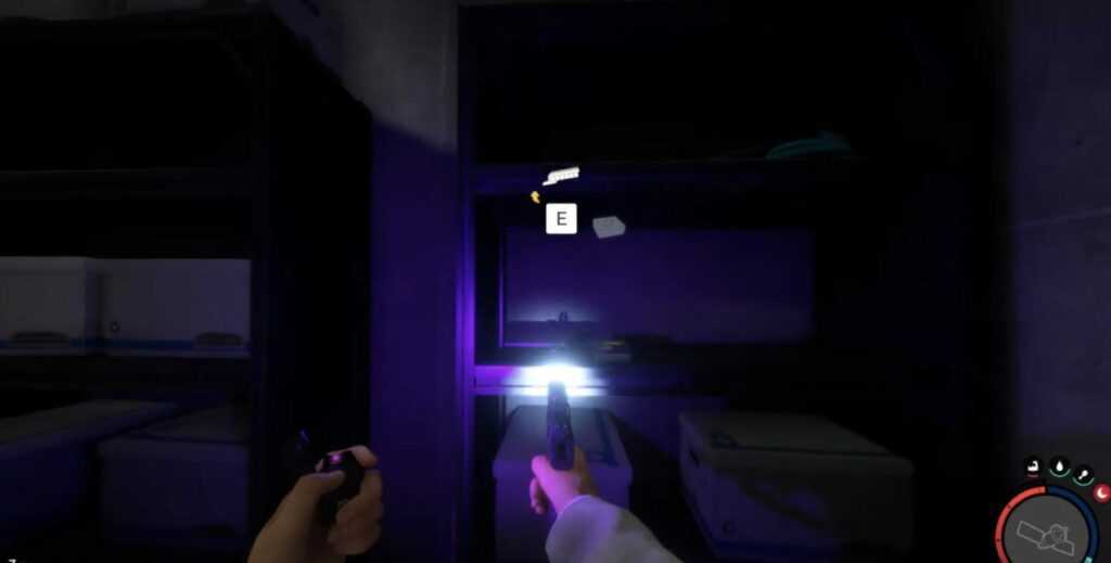 С левой стороны затопленного коридора есть открытая дверь: через нее нужно проплыть. Пройдите через нее к лестнице, ведущей в комнату охраны. Как только вы войдете в комнату, посмотрите направо. На стеллаже, на предпоследней полке, есть крепление.