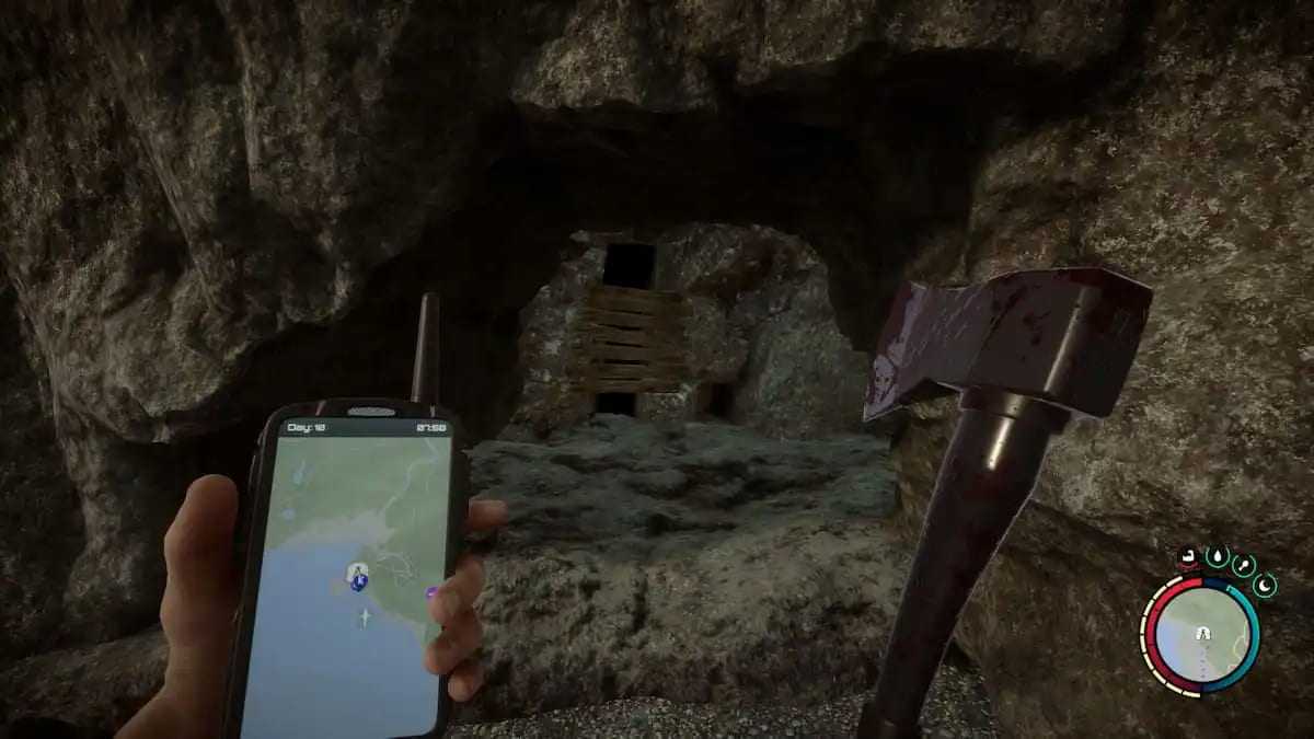 - Вы можете найти электрошокер в пещере на изображении слева. Вы можете получить ребризер, который вам нужен для поездки, чтобы получить лопату в той же пещере.