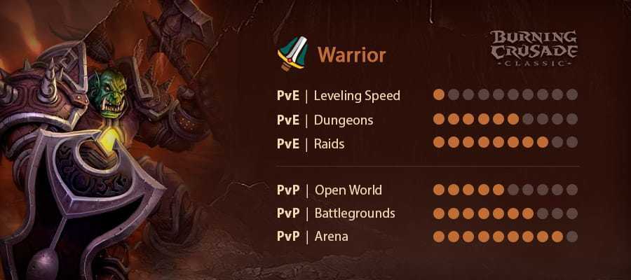 Когда дело доходит до PvE все специализации жизнеспособны. Воины защиты — проверенные танки и определенно лучший выбор для основного танка. Оружие также может неплохо проявить себя в Burning Crusade, особенно теперь, когда у обеих фракций есть тотем шамана неистовства ветра. Напоминаем, что Shattering Throw не был добавлен в игру до Wrath of the Lich King, поэтому воины не могут сломать божественный щит, как священники, что является для них довольно классной новой способностью. Еще одним недостатком воинов является то, что они очень медленно развиваются, как и в Vanilla, у них высокая зависимость от снаряжения, особенно когда дело доходит до оружия, и им трудно выполнять некоторые из более сложных квестов. Сразиться с более чем одним мобом за раз в качестве воина может быть проблемой, и вы обычно умрете, если это произойдет, в довершение всего низкая мобильность, и это переводит воинов на самый сложный и медленный класс для уровня. Многие утверждают, что воины были побеждены в Burning Crusade, и в этом есть некоторые достоинства. Воины — отличный выбор как для PvE, так и для PvP, если вы можете измельчить своего воина до 70.