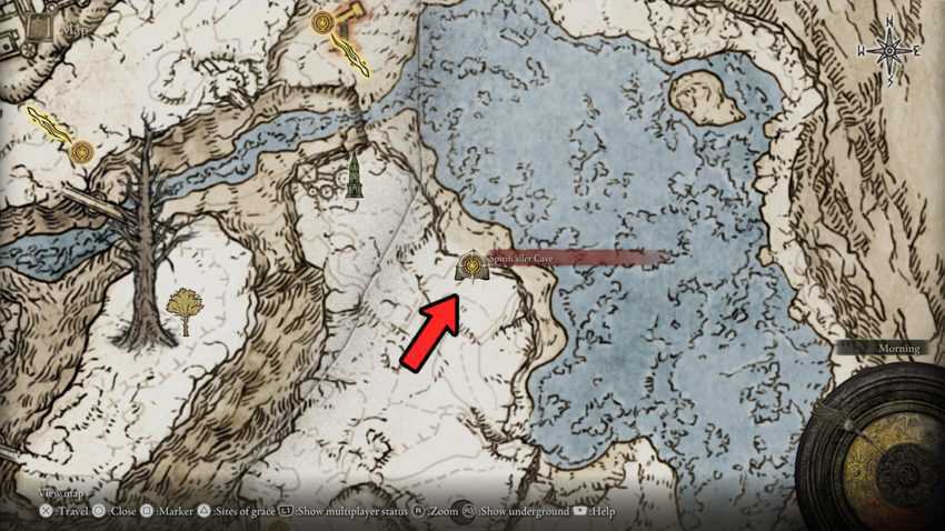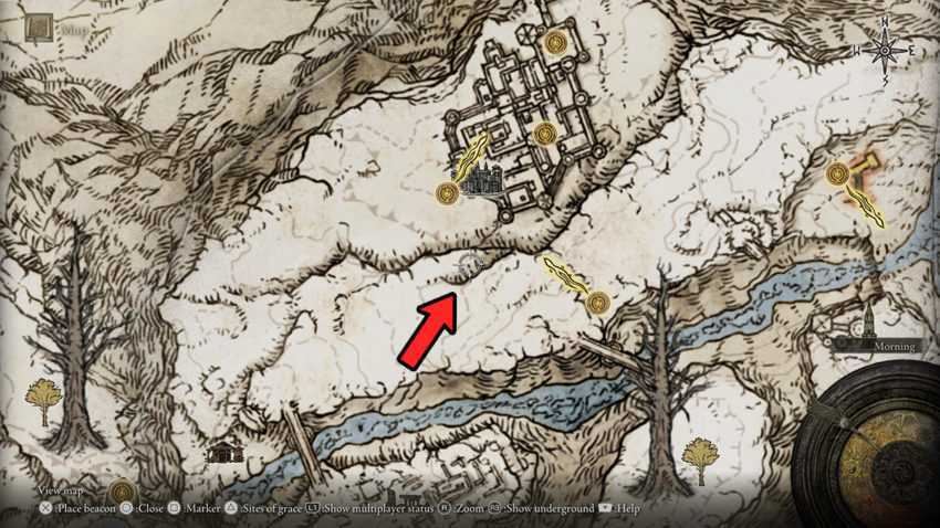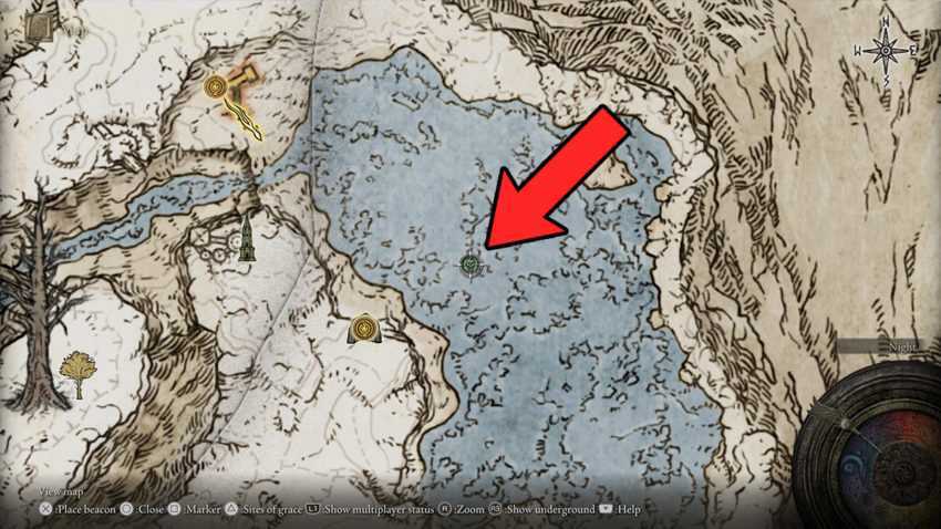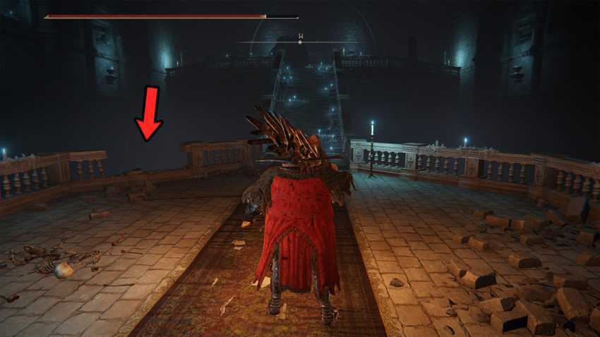 Прежде чем вы сможете сразиться с этим боссом, вам нужно знать, как добраться до Освященного снежного поля — вот путь. Бродячая Слеза Мимика появляется внутри Скрытого Пути к Халигтри как босс подземелья. Чтобы найти путь, подойдите к балкону на скриншоте выше; это всего лишь внизу от врага Land Octopus. Спрыгните через сломанные перила, чтобы приземлиться на невидимую лестницу, которая приведет вас к катакомбам, в которых находится босс.
