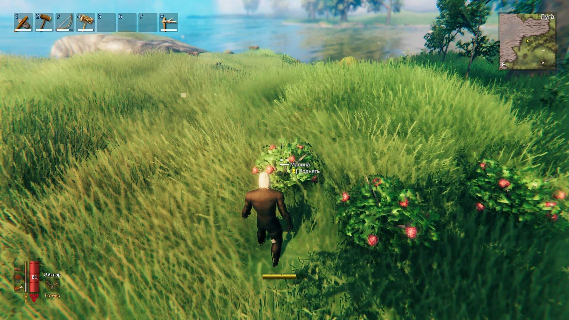 - Малина (здоровье +10, выносливость +20). Эту ягоду можно найти везде, а еще она очень быстро вырастает вновь. Для сбора малины достаточно найти найдите куст с ягодами, подойти к нему и нажать клавишу «Е».