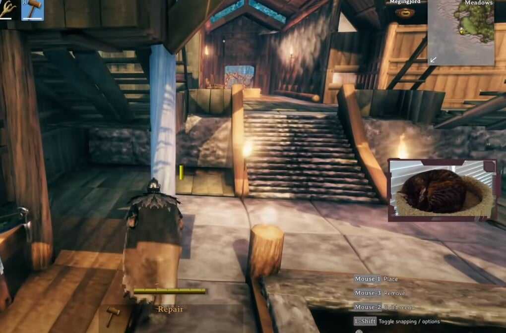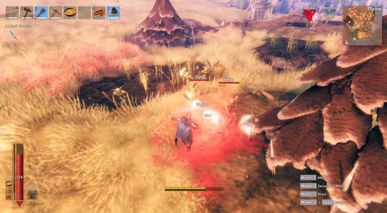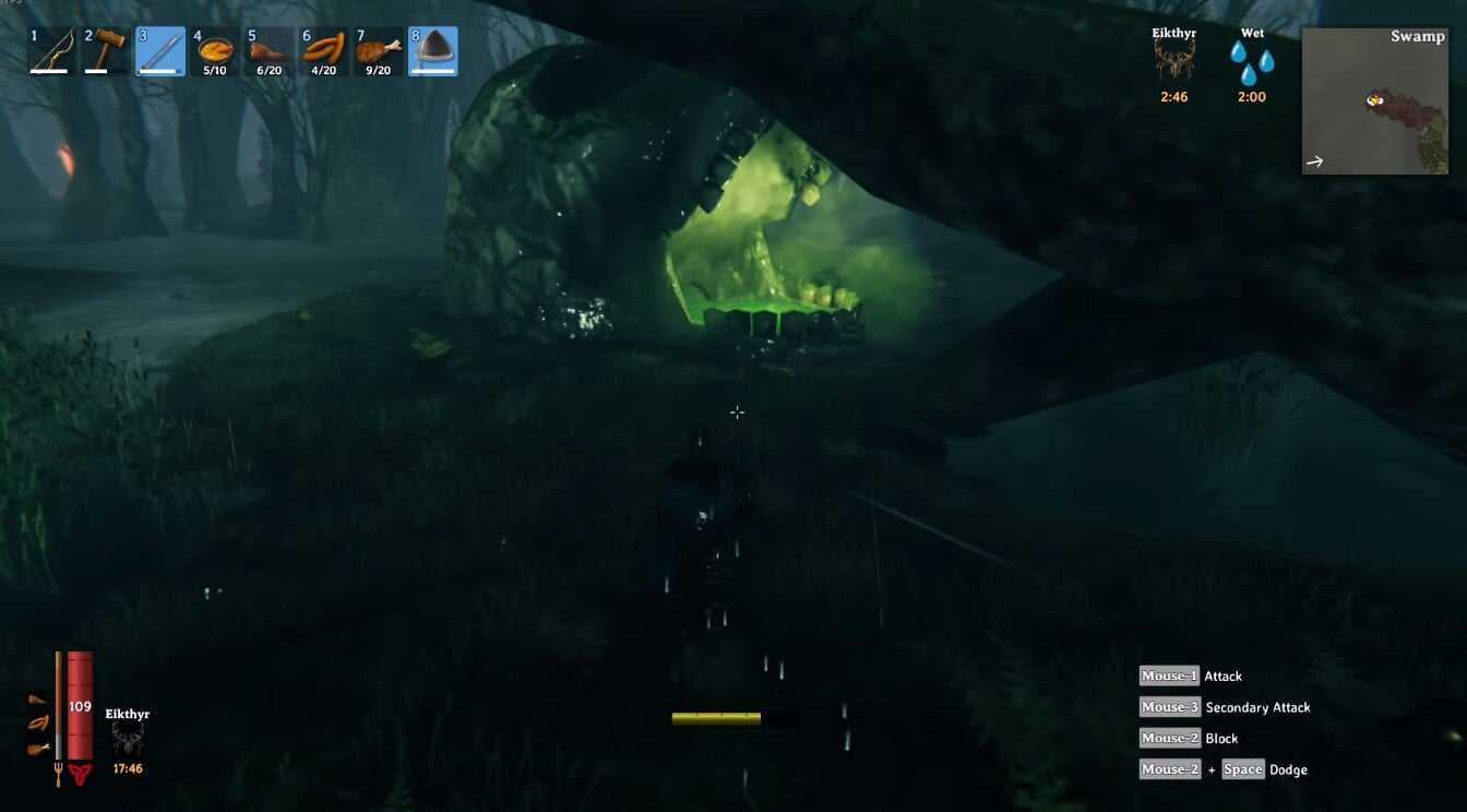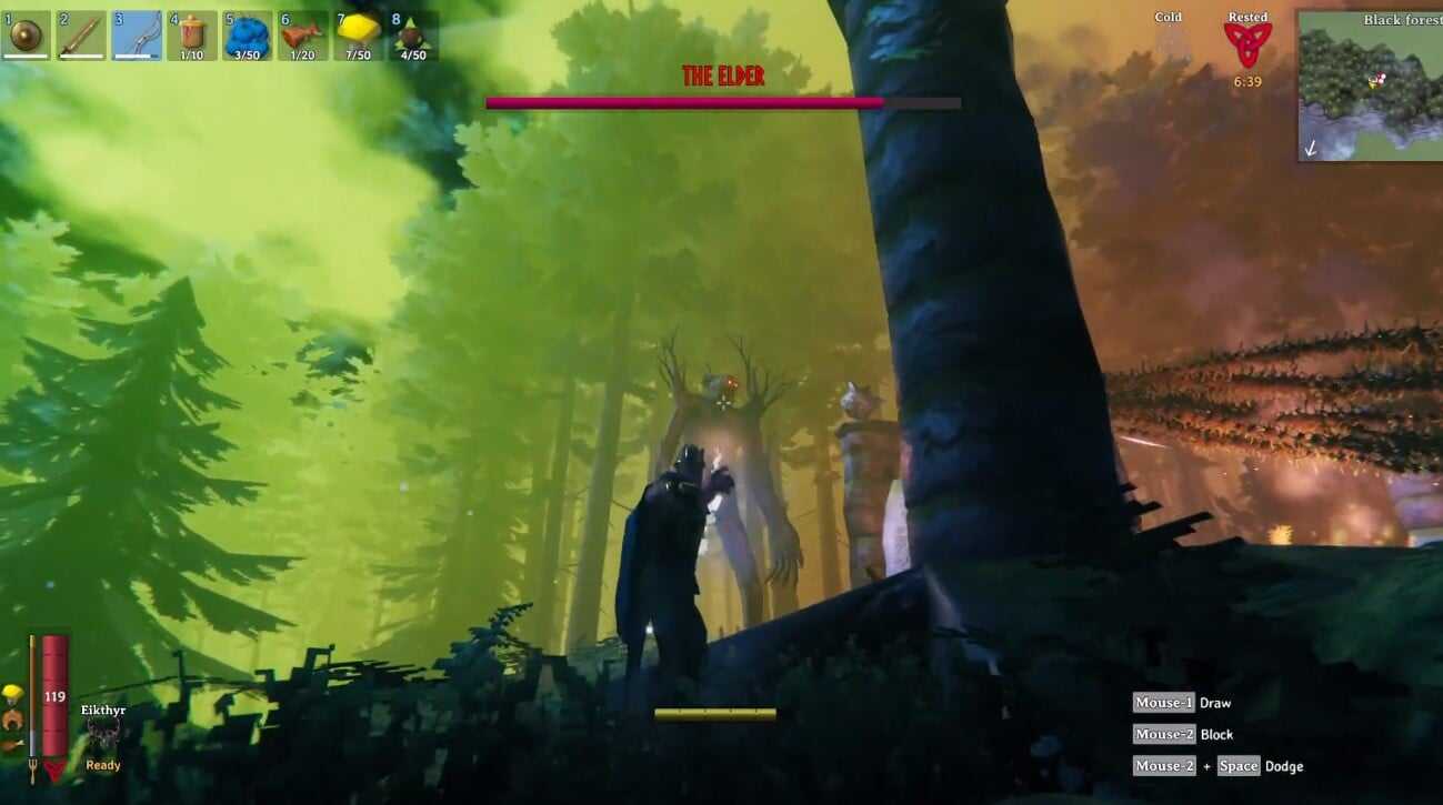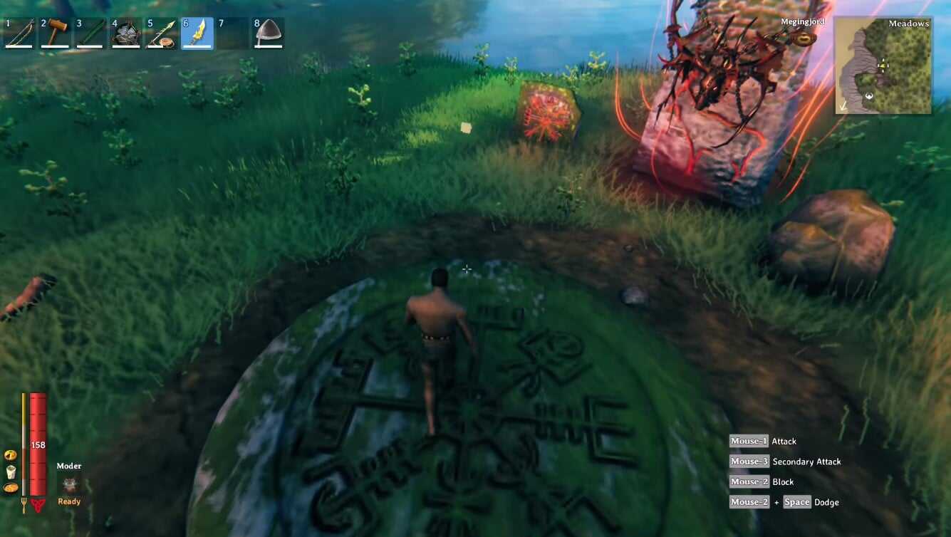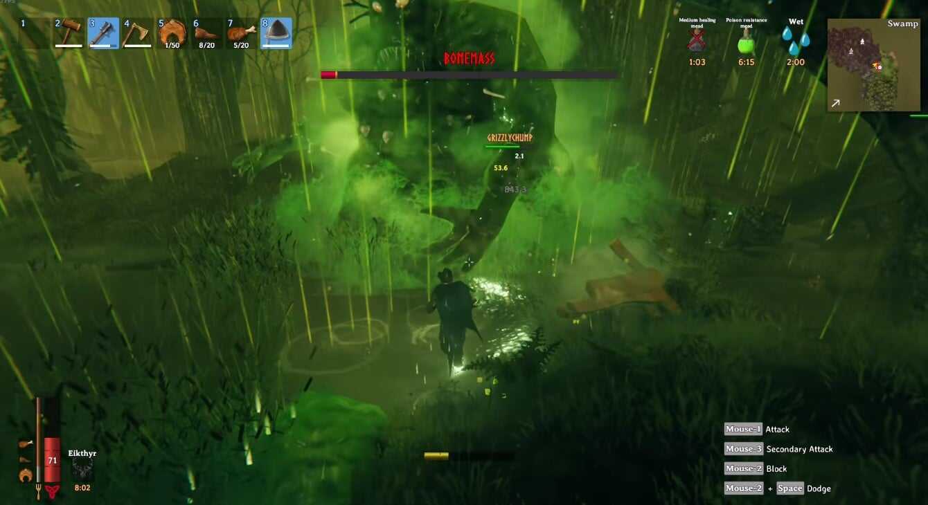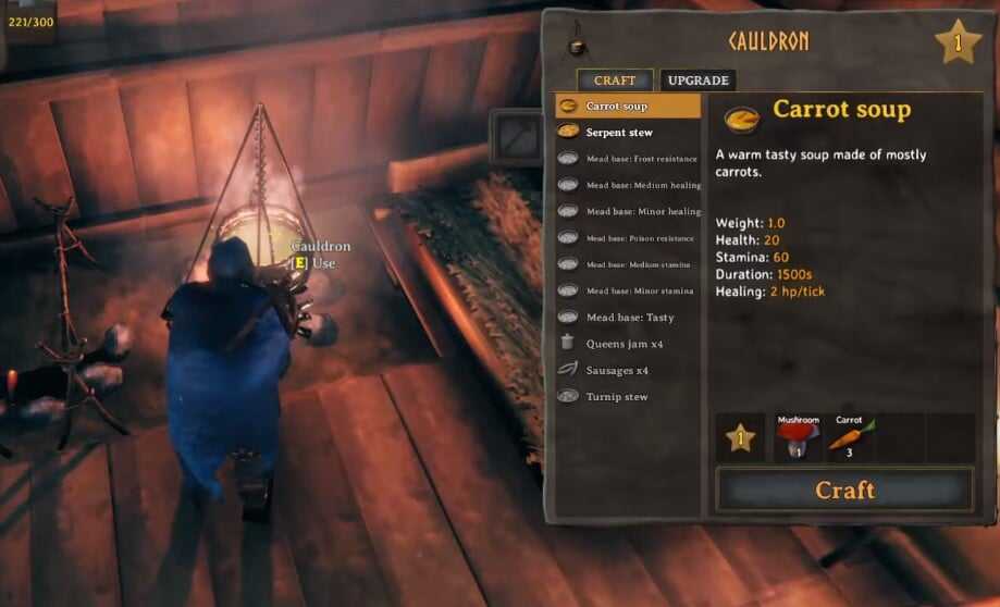 У героя Valheim две характеристики – здоровье и выносливость. Вы могли заметить, что в игре нет уровней и возникает вопрос – как прокачивать здоровье? Ответ прост – здоровье качается само при употреблении пищи. Уже на старте игры питайтесь малиной и грибами – их можно есть сырыми, и они дают бонусные 15 HP. Более сложные блюда нужно готовить на костре или в медном котле. Внимательно следите за приготовлением пищи – еда может сгореть, и вы останетесь голодным. В котле, помимо еды, можно делать медовуху. Она заменяет в игре зелья и дает различные бонусы (например, сопротивление яду или холоду).
