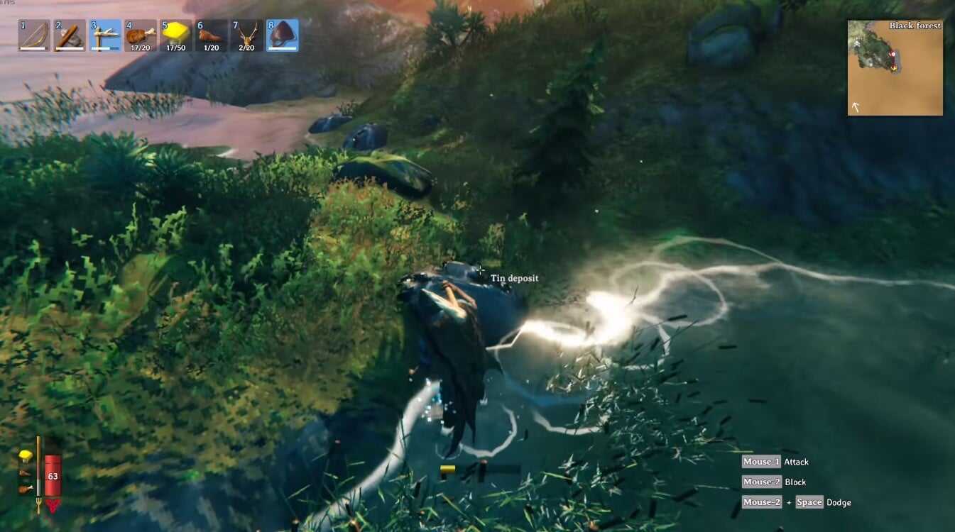 Черный Лес – здесь вы проведете много времени за добычей олова и меди, а также в сражении с врагами, которых здесь куда больше, чем на лугах. Кроме грейлингов встречаются скелеты и тролли. Лес особенно опасен ночью – лучше пережить время до рассвета в доме. Для рубки доступны пихты и сосны – их древесина ценнее, чем дерево бука. Здесь вы впервые увидите склепы со скелетами. В локации иногда появляется торговец, у которого вы найдете удочку и аксессуар, повышающий грузоподъемность персонажа.