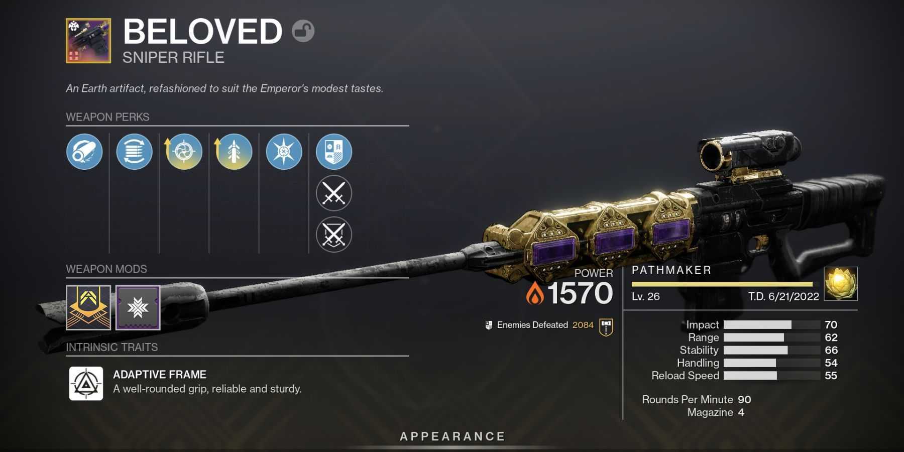 Вернувшись к оружию PVP, Возлюбленный поднялся в рейтинге, как только вернулся в качестве роскошного оружия. Снайперская винтовка Solar отодвинула в сторону большинство других фаворитов, таких как Adored и 1000 Yard Stare, и даже может конкурировать с экзотической снайперской винтовкой Cloudstrike, которая занимает значительно больше времени, чтобы прицелиться, несмотря на свой собственный перк Mortal Polarity.
