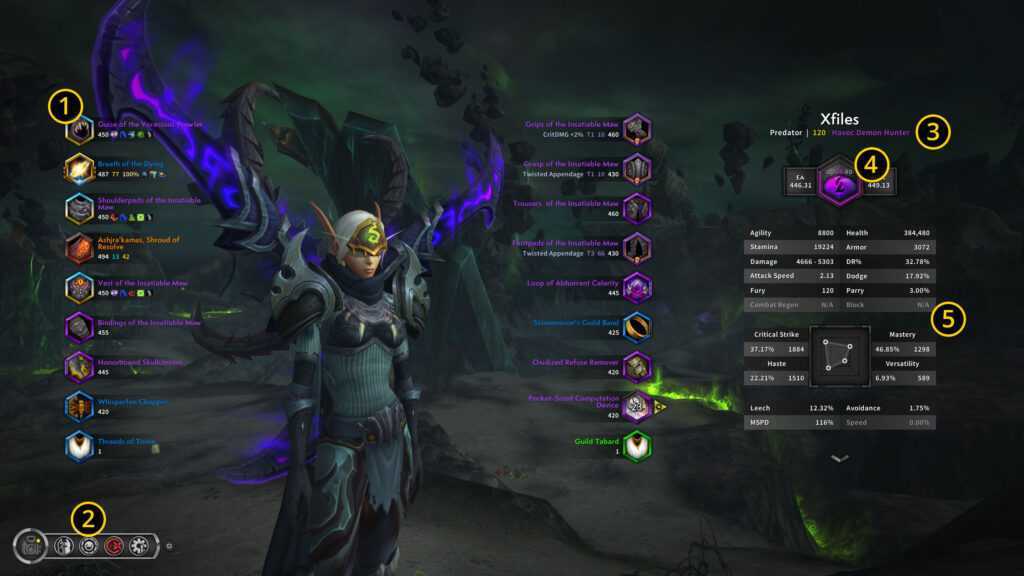 Text windows are helpfully divided between chat channels, and loot and other screen-scrolling information. At the bottom of those windows and your mini-map, tiny configurable status displays tell you everything from how many War Resources you have to what your durability is at to how many free bag spaces you have left (currently zero, of course, given the huge array of bag-hogging items from Battle for Azeroth’s patches.) They can also give one-click access to your bags, your guild, or your friends list.