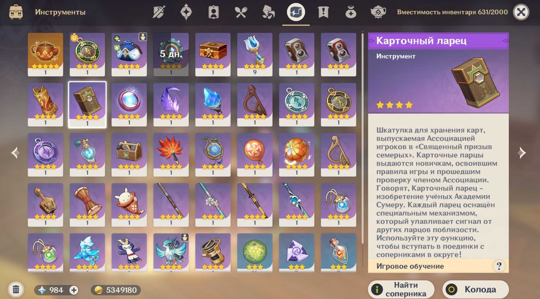 После прохождения обучения у Принца вам выдадут новый инструмент под названием Карточный ларец. Используя его, вам удастся находить соперников в различных уголках Тейвата и сражаться с ними в карты.