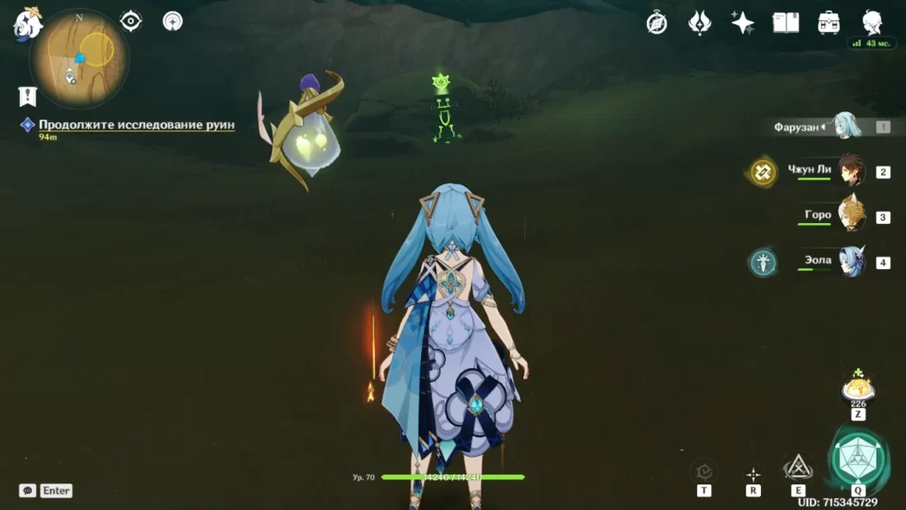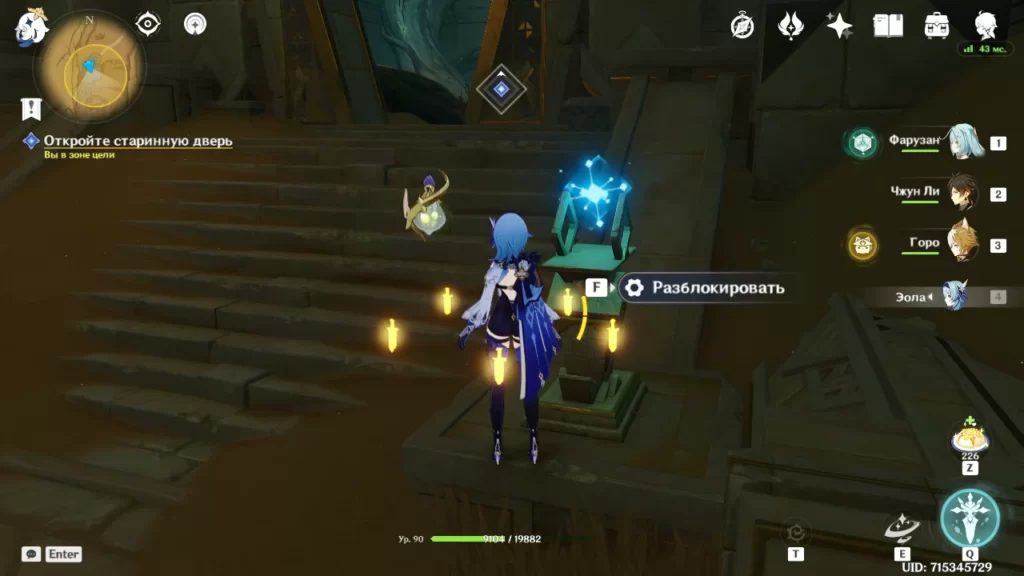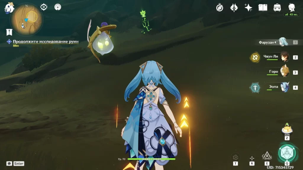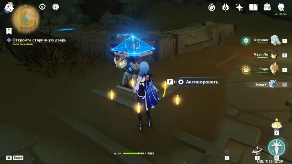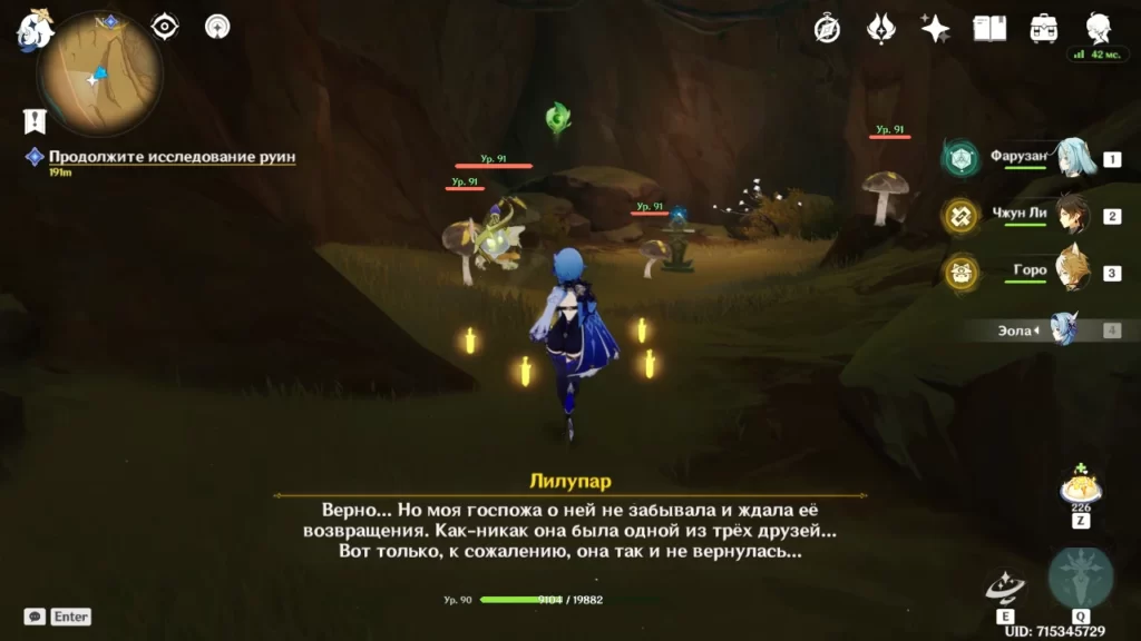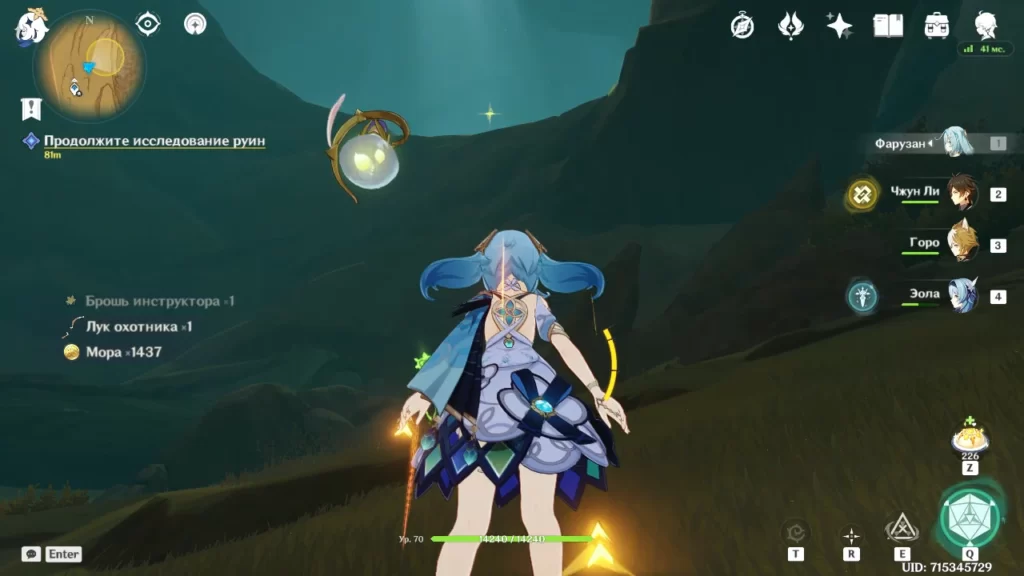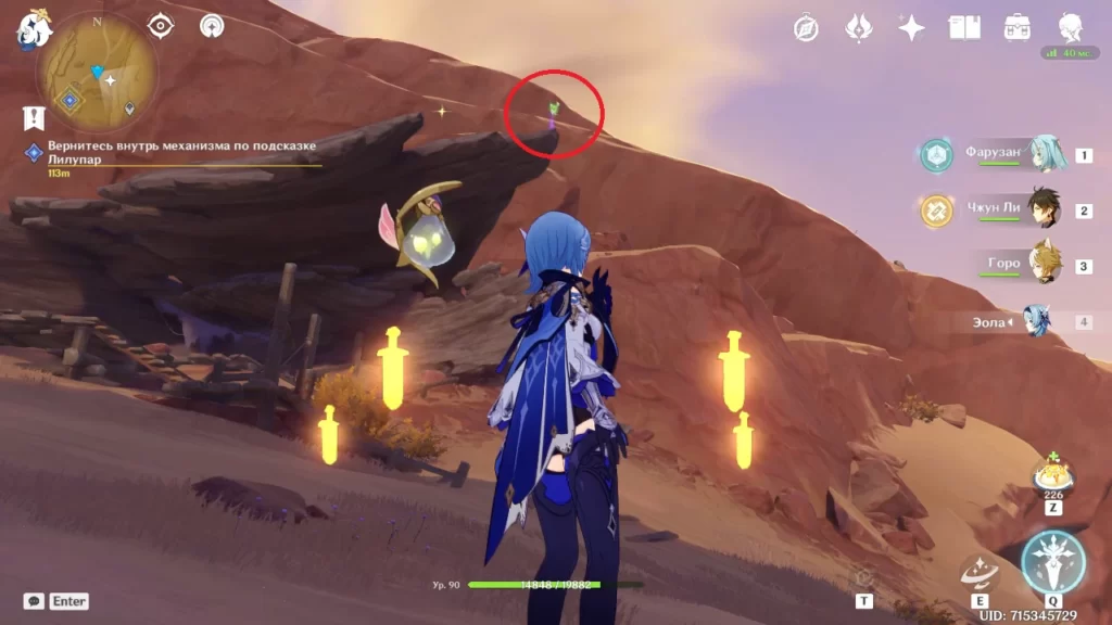 Робот разваливается и мы в последний момент успеваем выбраться наружу. Идем в направлении подсвеченном маркером (в сторону группы людей). Оказывается нас уже поджидает предатель Адерфи в компании фатуи. Расправляемся с противниками и подбираем предмет, который выронил Адерфи.