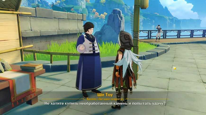 После этого подойти к местоположению Ши Тоу, хозяина магазина “Загадки нефрита” и главного действующего персонажа. Продавец находится в гавани Ли Юэ, недалеко от нижнего телепорта.