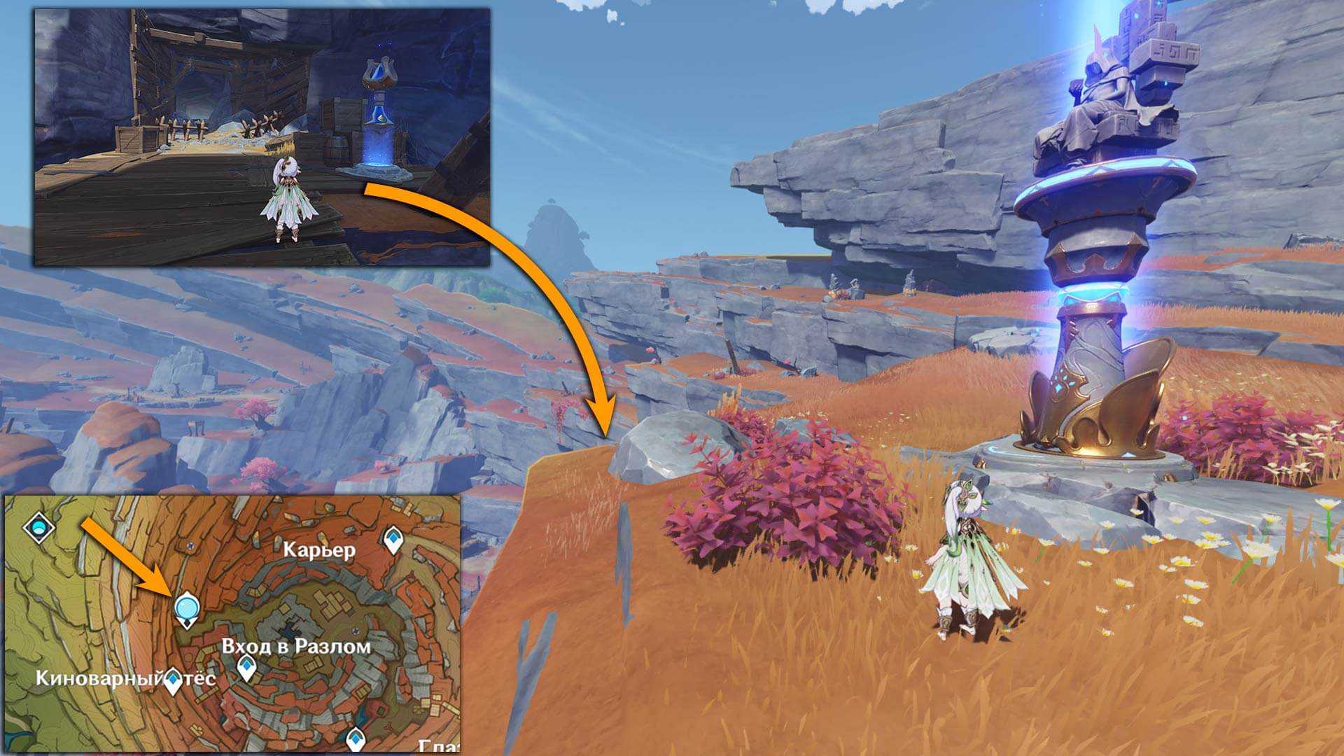 Посетить Сумеру можно с любого Ранга приключений, для этого не требуется выполнять какие–либо задания. Перемещаемся в Разлом к Статуе Гео Архонта и прыгаем вниз. Возле новой Точки телепортации находим вход в пещеру, которая приведет нас в Сумеру.