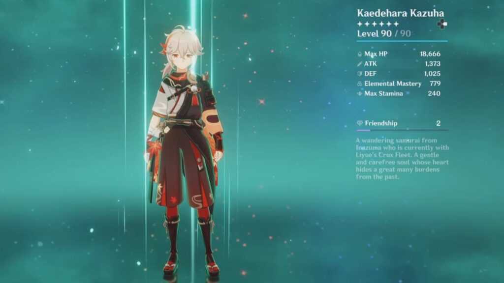 Самурай из клана Каэдэхара и член команды The Crux, Каэдэхара Казуха — персонаж Анемо, владеющий мечом, который может наносить тонны урона, а также усиливать стихийный урон команды. Он — отличный выбор для команд Amplifier Reaction, таких как Melt и Vaporize. Его обычные атаки позволяют ему выполнять пять быстрых атак и два заряженных быстрых удара. Хотя его потенциал урона и смещения Swirl меньше, чем у Venti, он компенсирует это своим щедрым вкладом в командный DPS. Казуха больше всего выигрывает от полного билда Elemental Mastery.